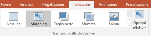 In PowerPoint 2016 è stata introdotta la funzionalità Morphing, un nuovo effetto cinematico che crea fluide transizioni animate tracciando e spostando immagini e altri oggetti tra più diapositive della presentazione.