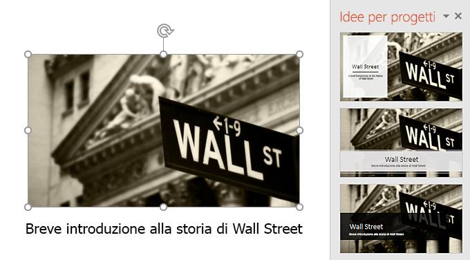 Il tempo scarseggia o si è a corto di ispirazione? PowerPoint può generare automaticamente diapositive dall'aspetto accattivante in base al contenuto che viene aggiunto. Inserire o incollare un'immagine nella diapositiva corrente e quindi scegliere il layout preferito nel riquadro attività Idee per progetti