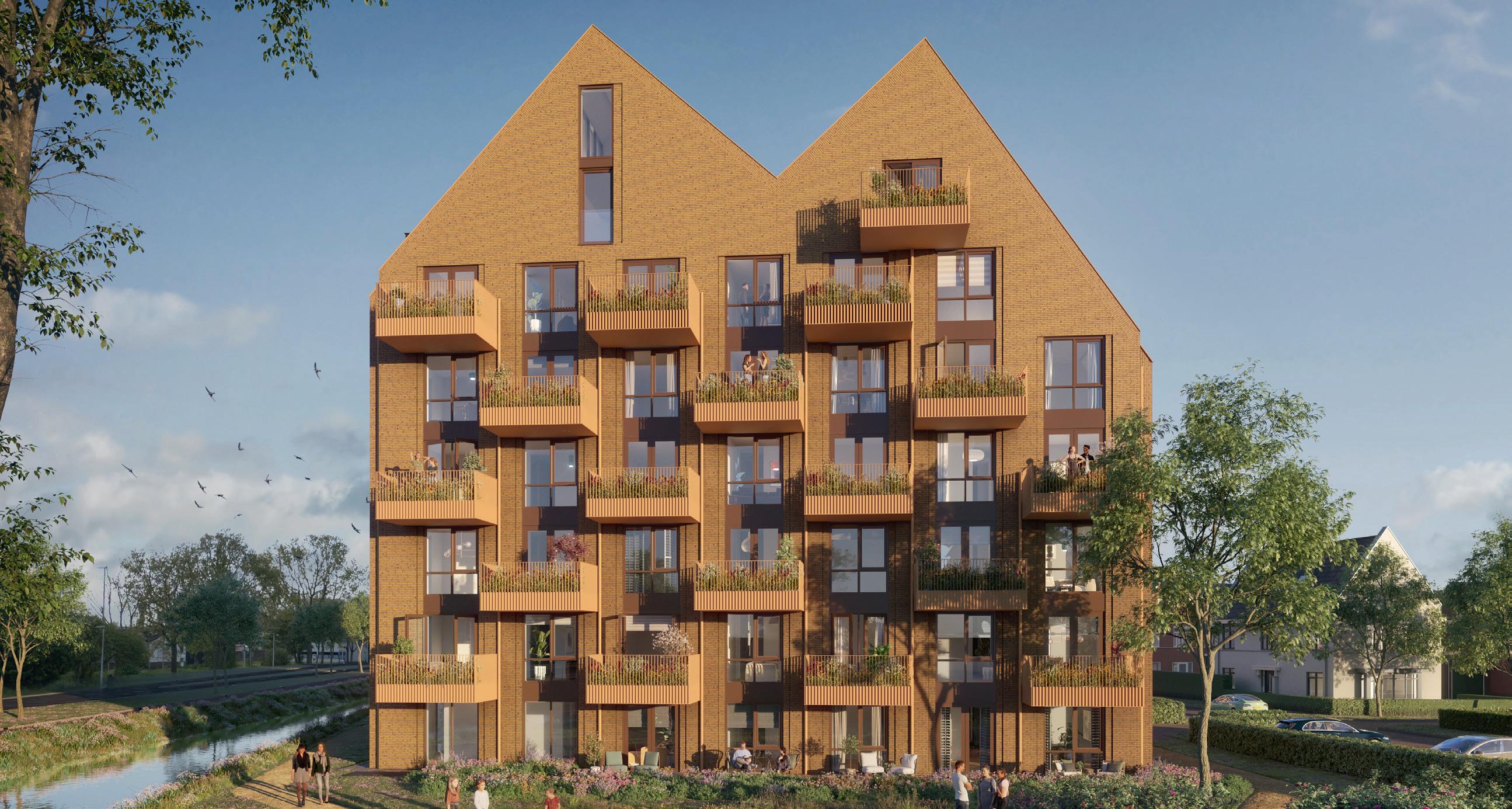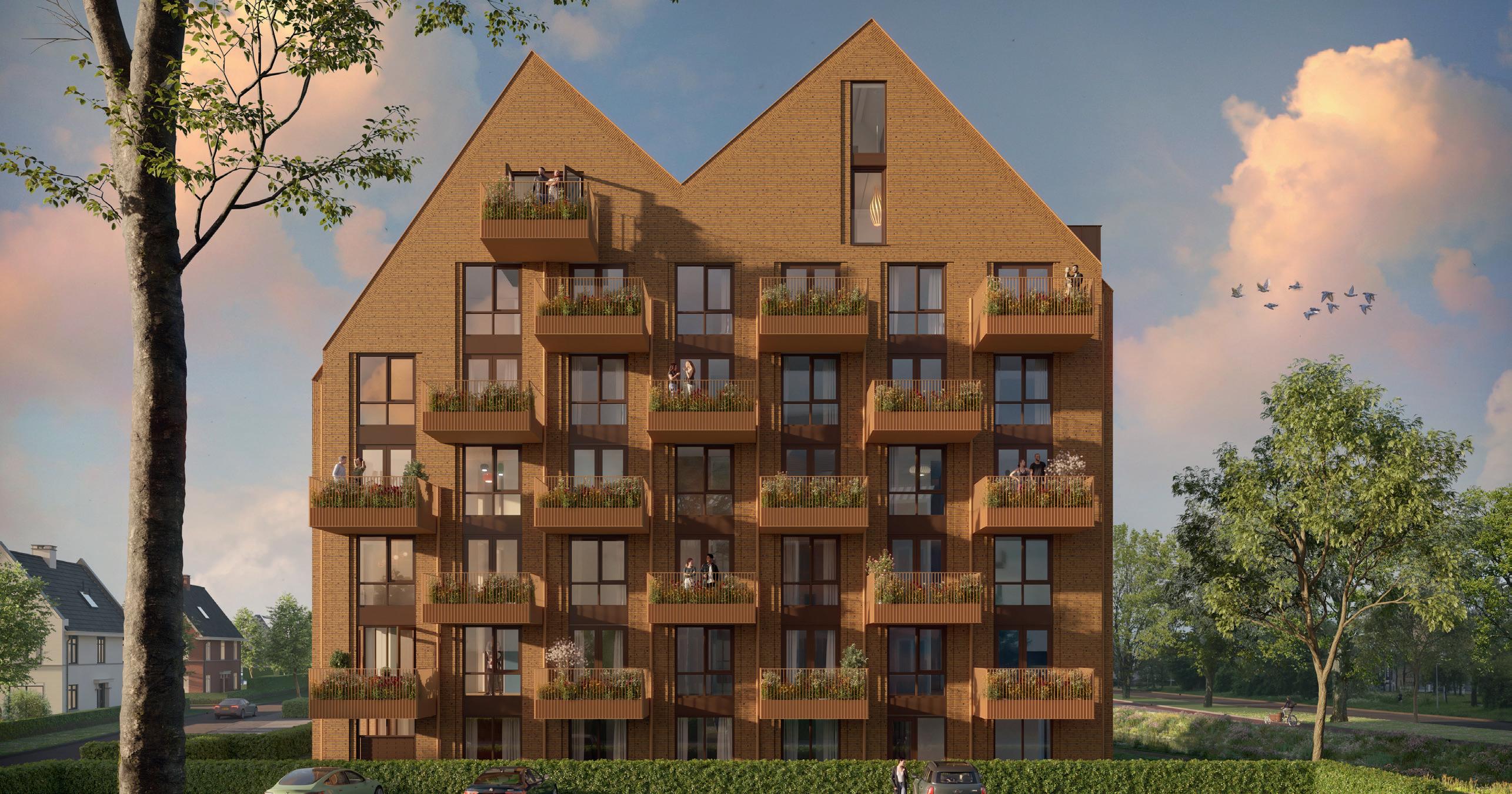 “We schetsten een huis zoals kinderen een huis tekenen. Met twee woonlagen, een deur, een raam en een kap erop. Die schets bliezen we vervolgens 200% op en het resultaat was een gebouw van vier woonlagen en een dubbele kap. Een groot huis dus, met daarin 34 appartementen verdeeld over 7 typen. Het leuke aan het gebouw is dat het ondanks de omvang echt oogt als een huis. Met grote raampartijen en loggia’s die zich over meerdere verdiepingen uitstrekken en eruitzien als dakkapellen. Ook de entree is twee verdiepingen hoog. Alles twee keer zo groot, het werkt echt in Waterroos.”