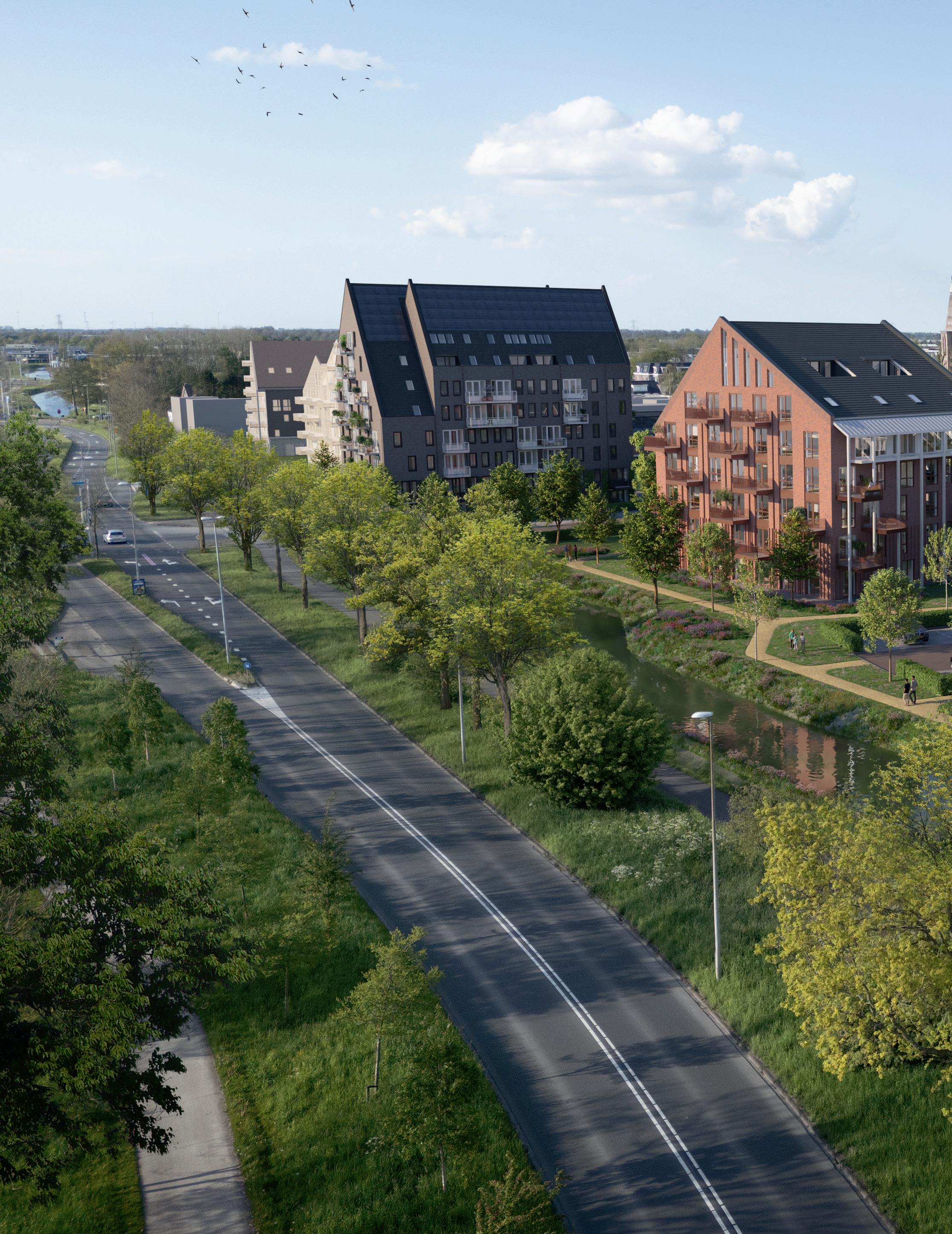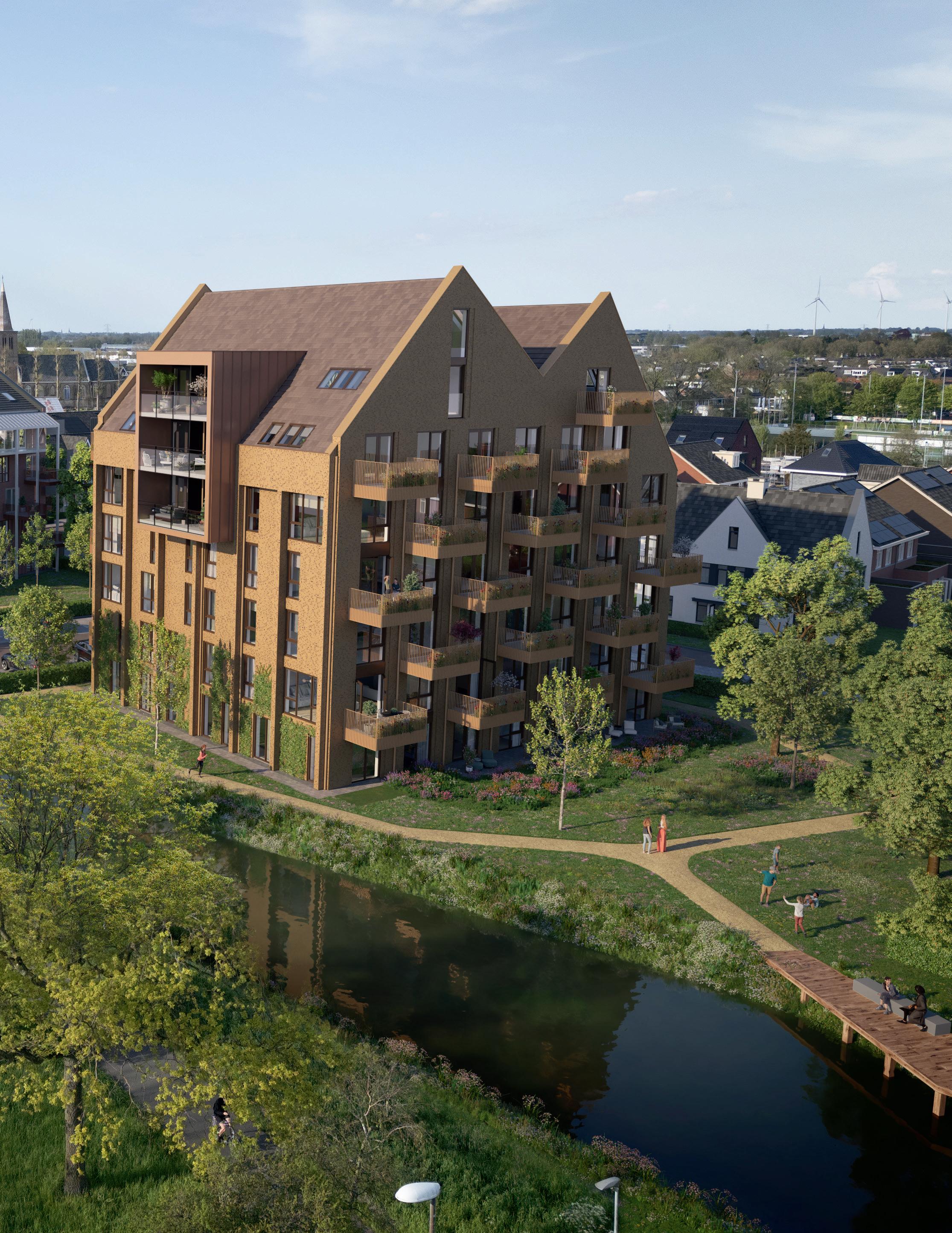 landschap, waar water en groen de hoofdrol spelen. De bestaande watergang wordt verbreed en krijgt oevers met rietkragen. Een fijn thuis voor flora en fauna. Vanuit je appartement kijk je uit over een ontspannen natuurrijke zone waar je heerlijk kunt wandelen en elkaar kunt ontmoeten, met groen tot aan het gebouw. En ook de gevels van Waterroos worden groen dankzij de extra diepe balkons met een grote plantenbak rondom, waarmee je een tuintje op je balkon kunt creëren. De planten in de bak zorgen voor extra privacy en geven Waterroos een extra groen aanzien.”