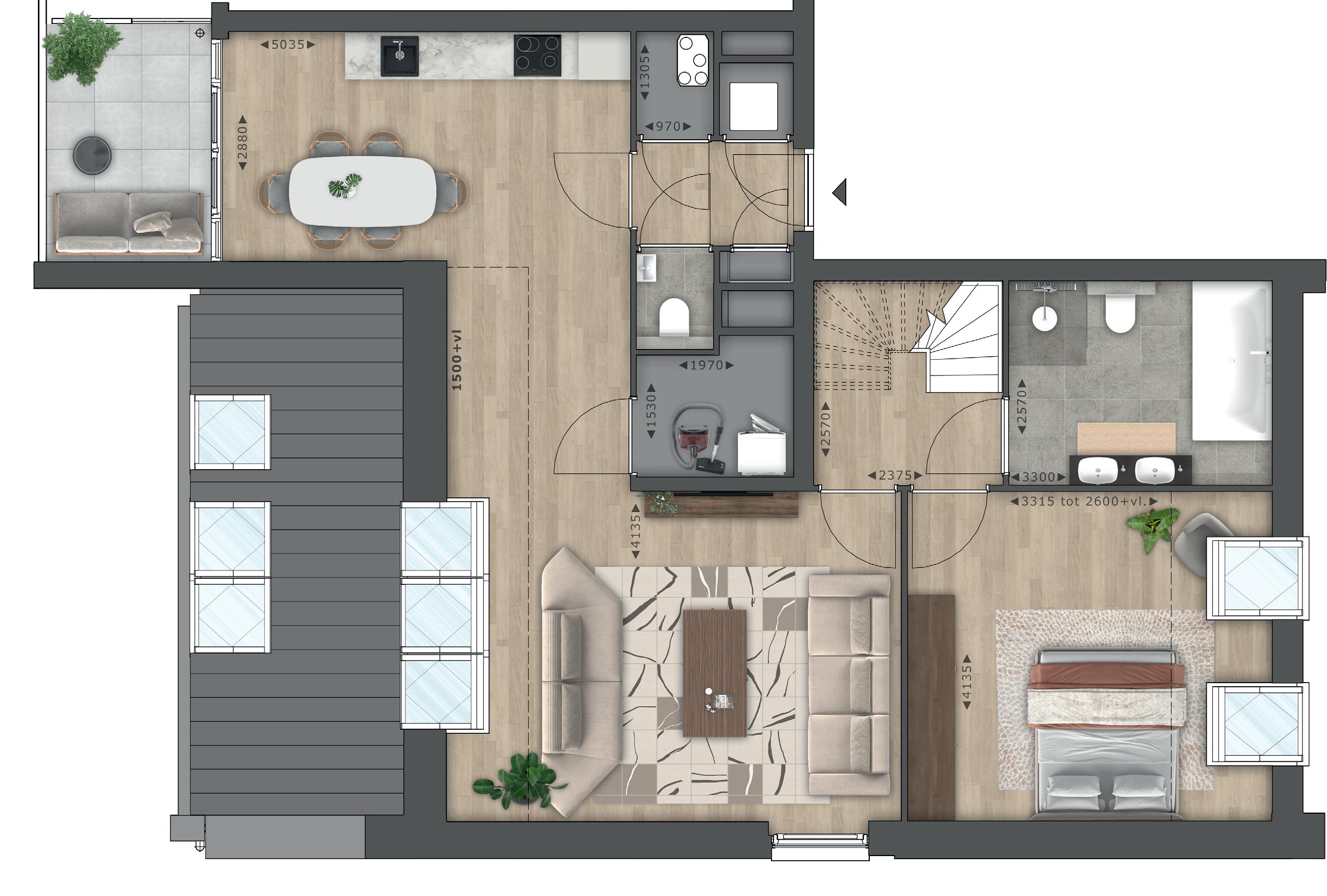 Je zult maar thuiskomen in dit werkelijk unieke appartement in Waterroos. Het bevindt zich op de zesde verdieping en het heeft als extra, verstopt tussen de twee kappen van het gebouw, een kleine beschutte oase waar je helemaal vrij zit en die je een fenomenaal uitzicht biedt over de omgeving. In dit penthouse krijgt wonen op niveau een geheel nieuwe betekenis. Type G is met recht de kroon op Waterroos.
