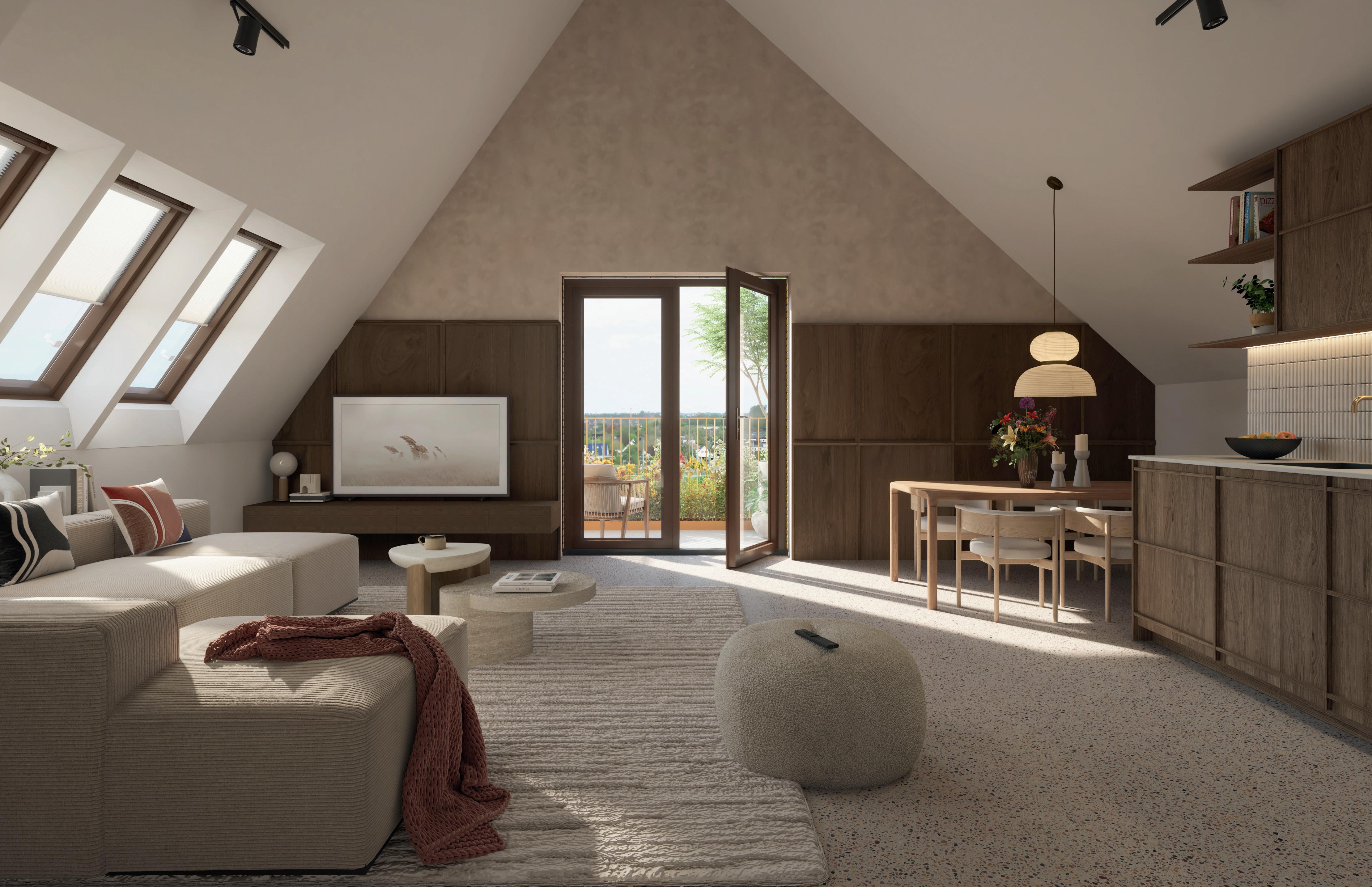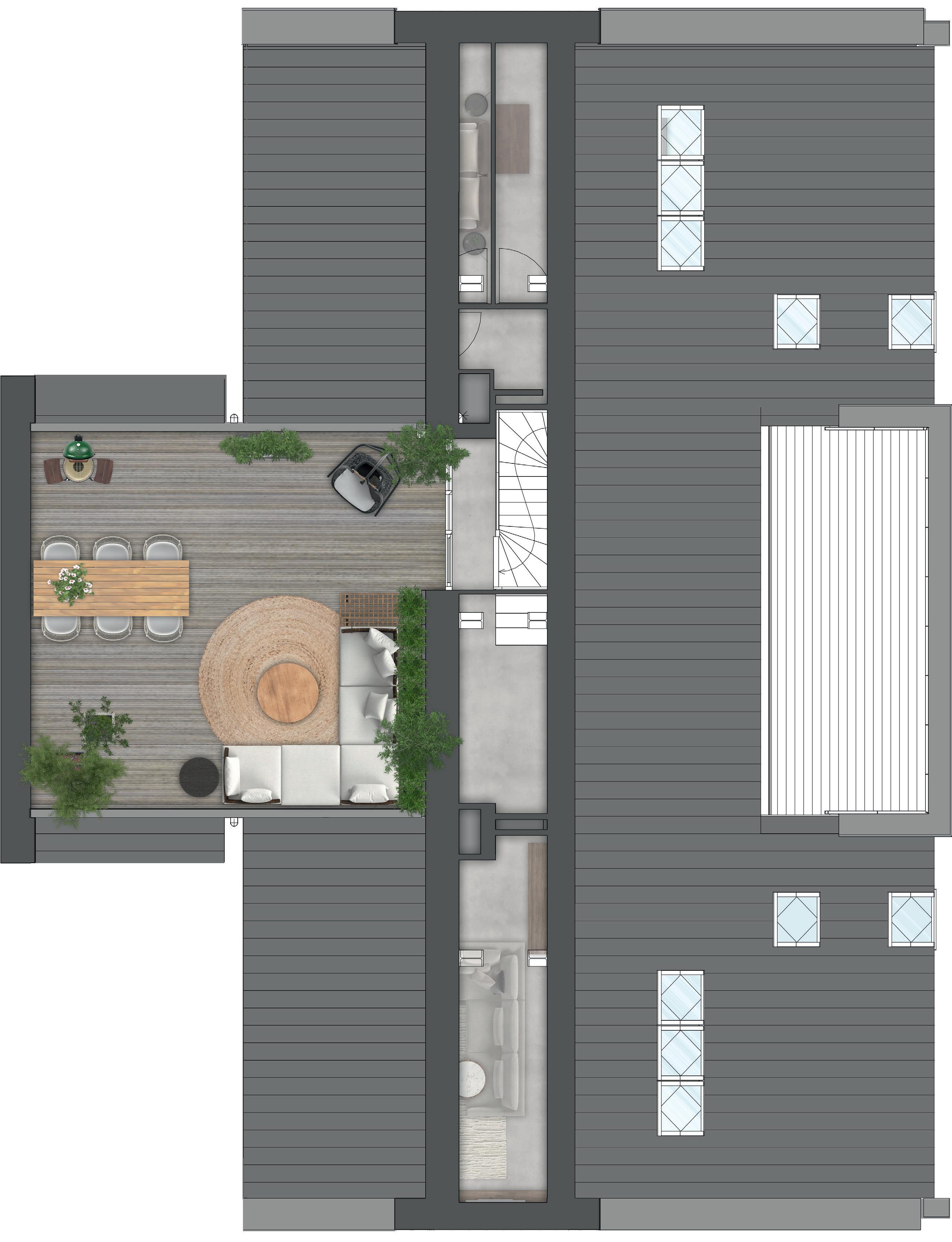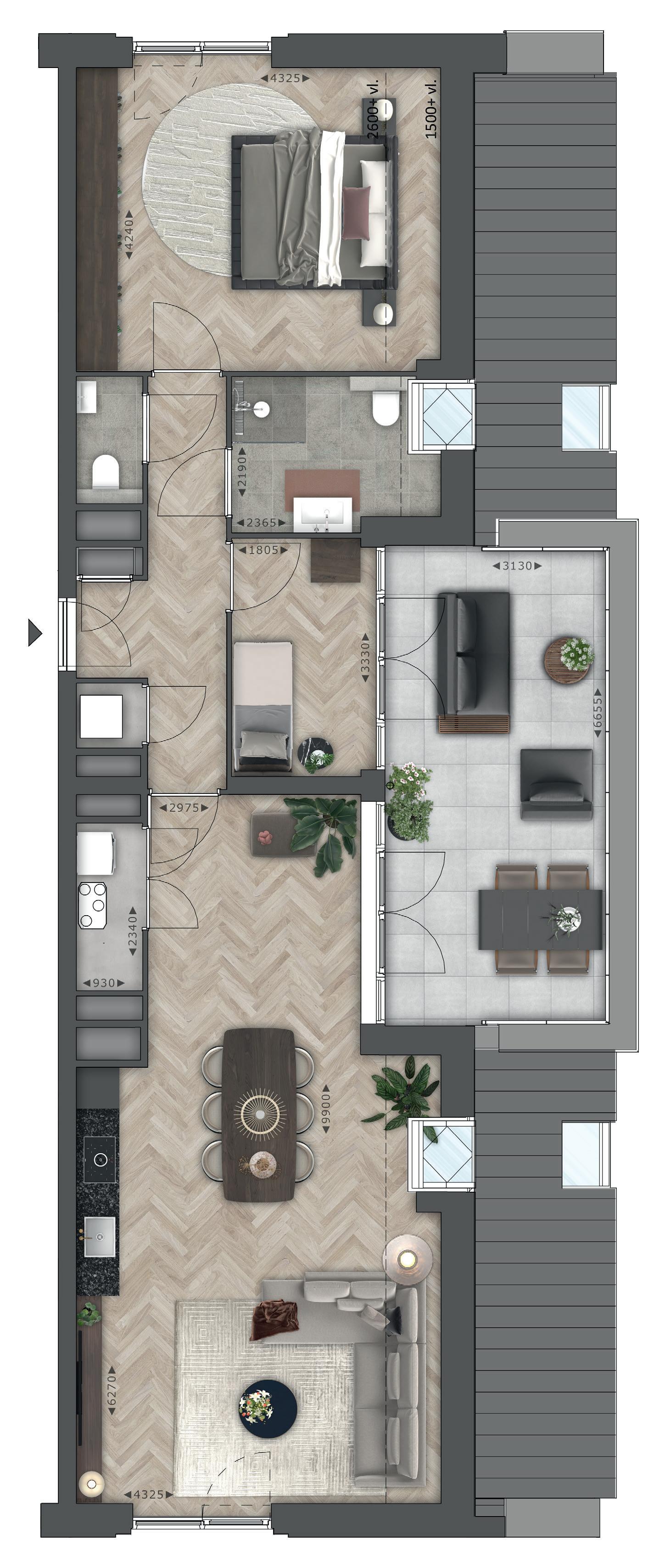 De architect noemt de twee appartementen van dit type ‘Loftwoningen met vide’. Ze bevinden zich op de zesde verdieping van Waterroos en hebben een extra vide-kamer in de kap van het gebouw op de zevende verdieping. Licht en ruimte typeren deze fraaie penthouses, die een zonnig dakterras hebben op het zuidwesten. Hier woon je pas echt op niveau met een uitzicht om van te watertanden.