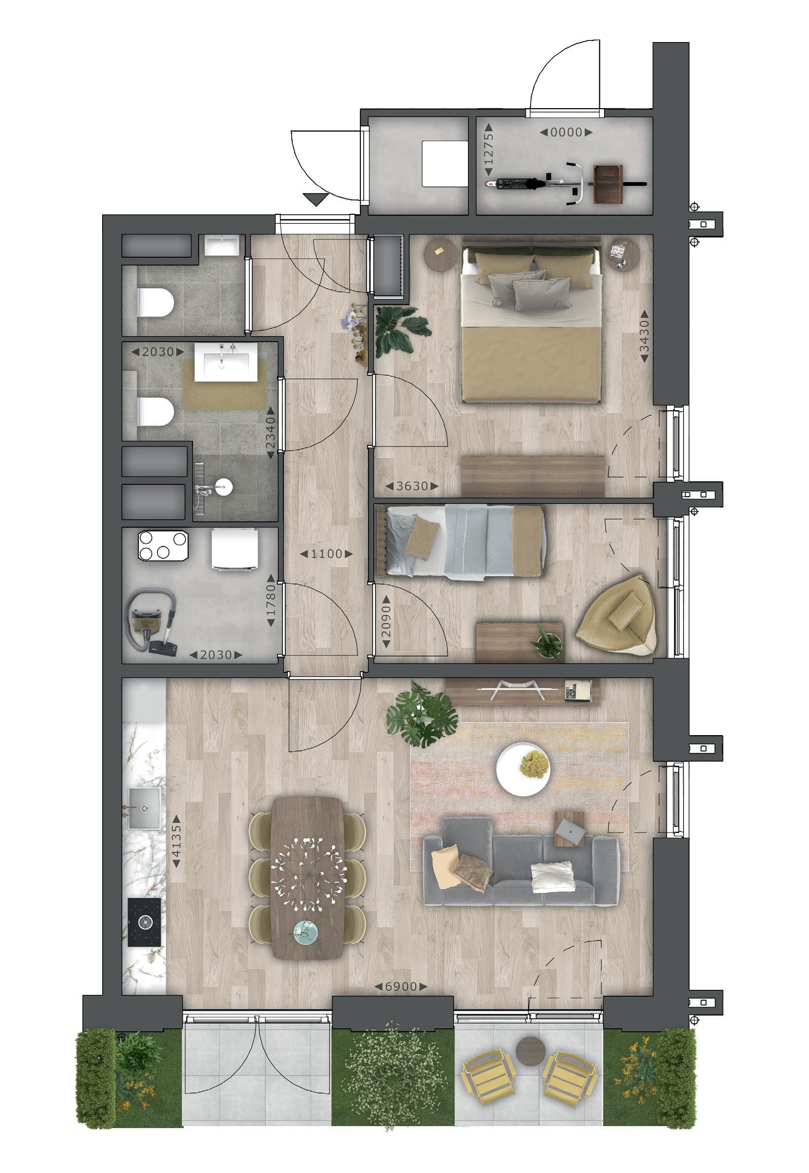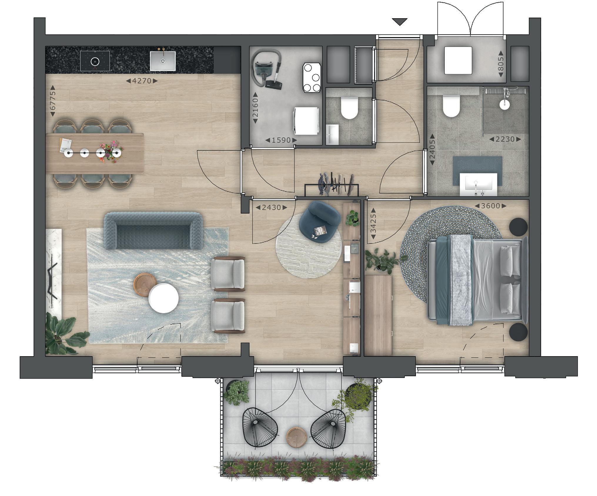 In Waterroos vind je 10 appartementen van Type D. Ze hebben een woonoppervlak van ongeveer 69 m2 en zijn heel compleet uitgerust met een zonnige woonkamer met open keuken, twee slaapkamers, een badkamer met douche, wastafel en toilet en een separaat tweede toilet op de gang. Fijn is de grote inpandige bergruimte die ideaal is als voorraadkast en plek voor je wasmachine en droger. Wil je nog meer ruimte dan bestaat de mogelijkheid om een slaapkamer te laten vervallen zodat deze ruimte bij de woonkamer getrokken wordt.
