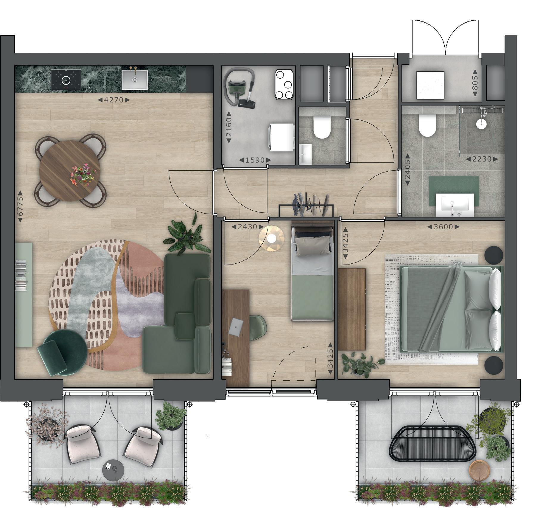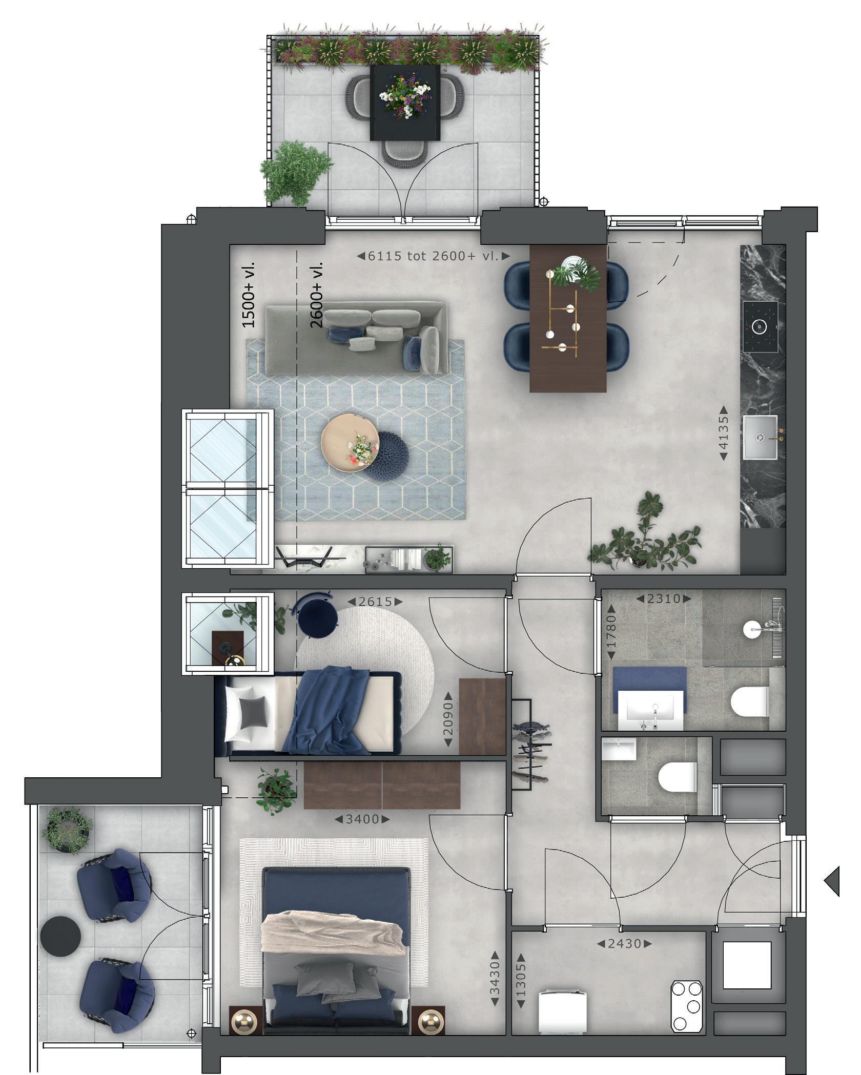Waar je voorkeur ook naar uitgaat; een appartement van Type C heeft standaard twee slaapkamers, een compleet uitgeruste badkamer en een tweede separaat toilet. De ruime woonkamer met open keuken heeft een balkon en bij sommige bouwnummers heb je ook nog een balkon aan de slaapkamer. De inpandige berging is groot genoeg als wasruimte en op de begane grond van Waterroos vind je een tweede privé berging.