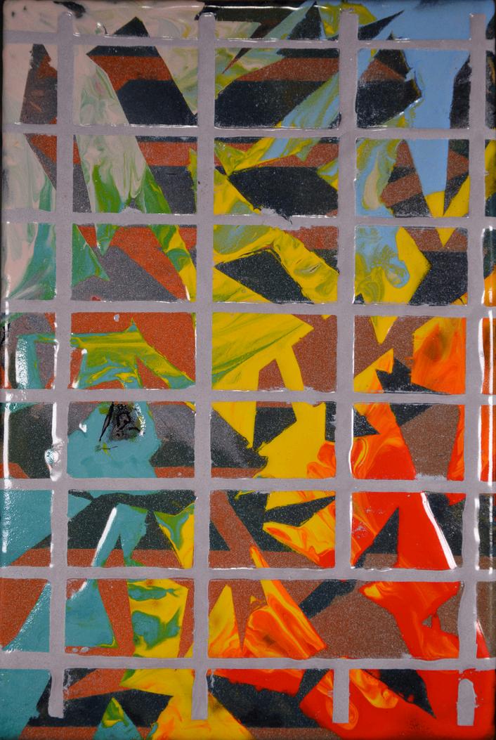 Omega, cseppek, rács 2024, akril, vizes bázisú zománc, rétegelt lemez, fa, 70 x 50 cm x 5 cm