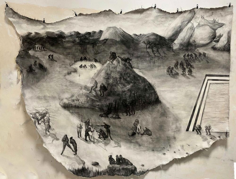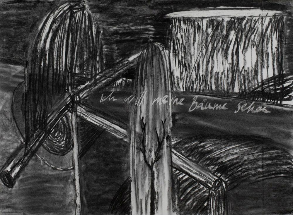 Sötét erdő (Természet/Rajz) 2025, szén, facsemeték, változó méretűek, 13 db 150x70x30 / db cm