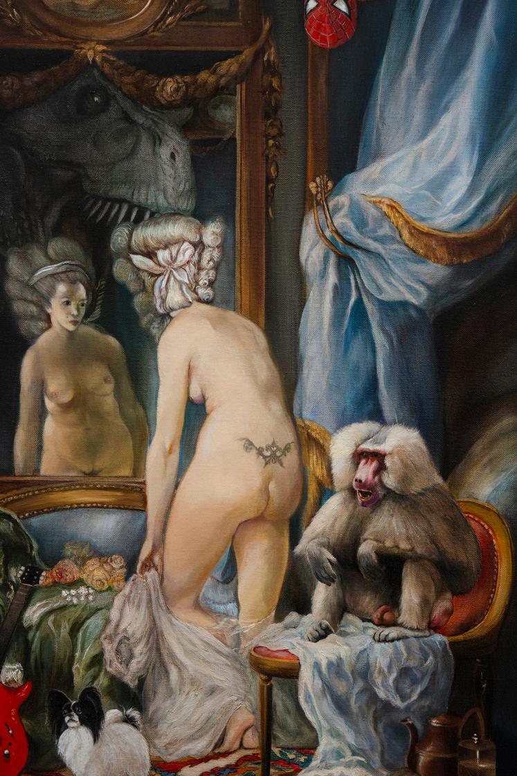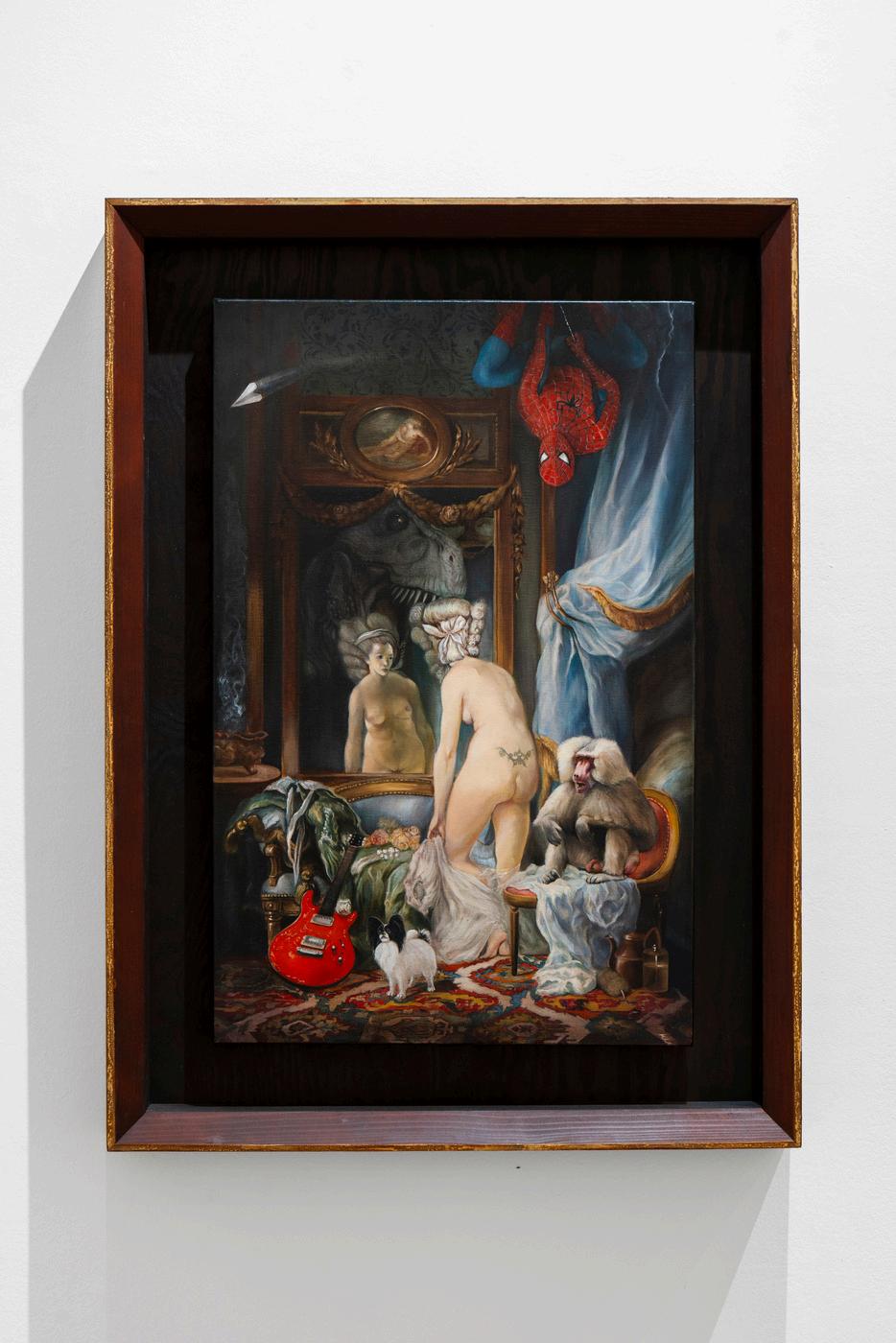 ARACHNIDÁK (J. F. Schall a szolgálatkész szolgálólány c. festménye után szabadon) 2025, olaj, falemez, 70x89 cm