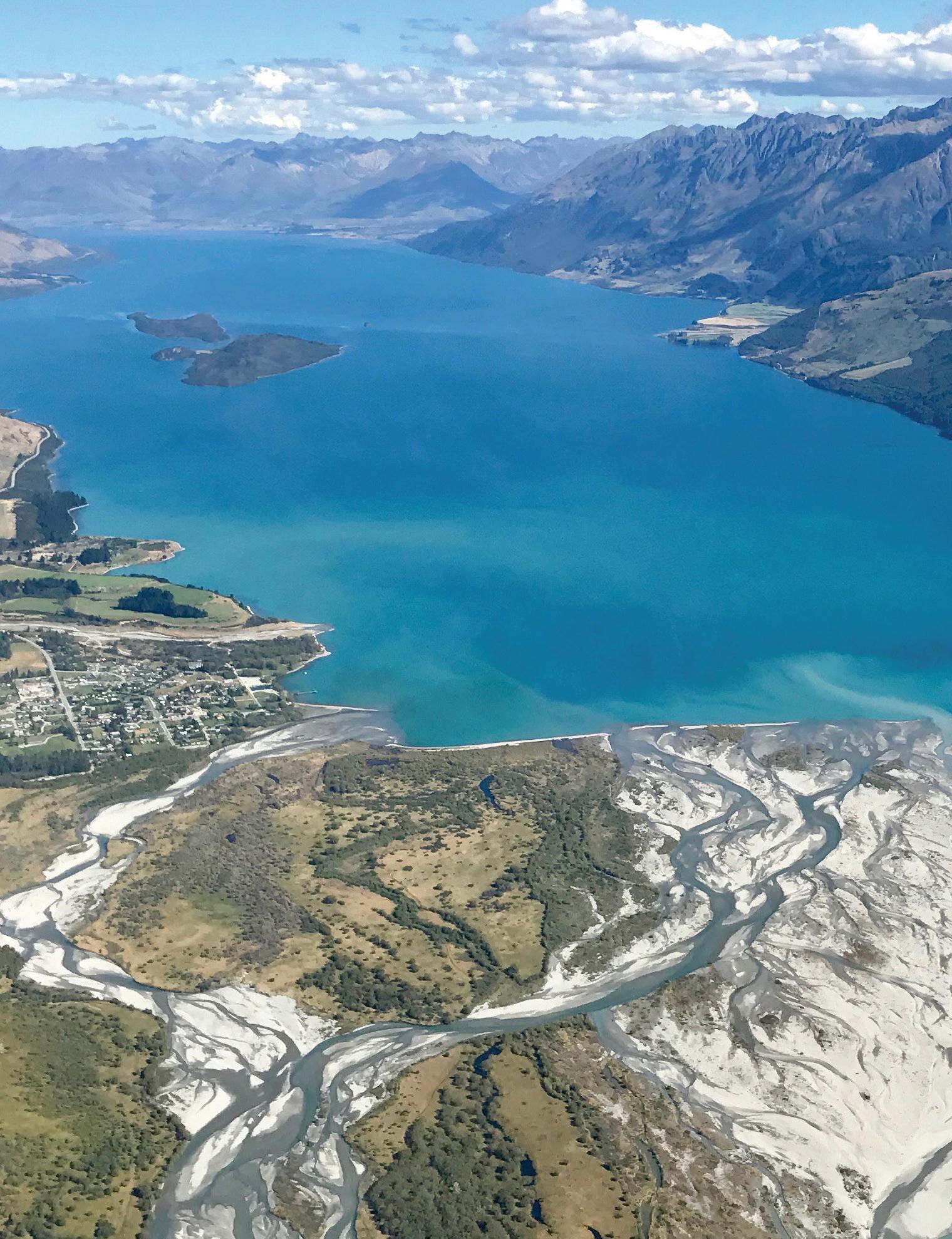 Helicopter view of Lake Wakatipu and Glenorchy, New Zealand.