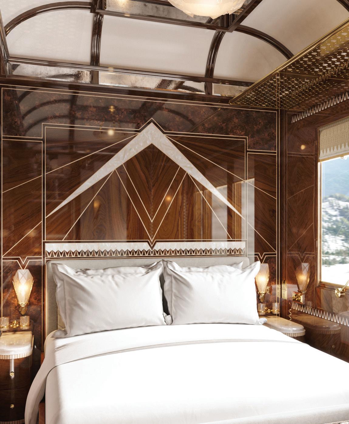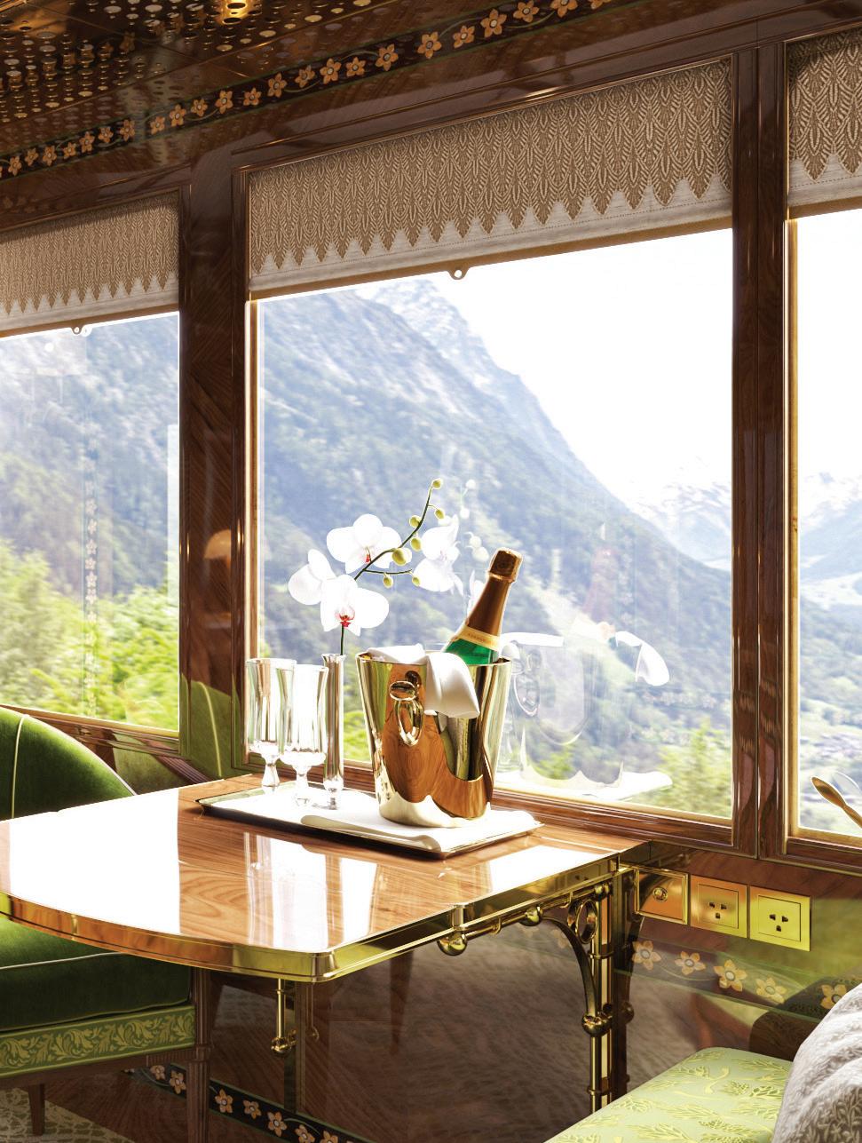 IT’S HARD TO IMAGINE a more roman tic (and nostalgic) way to travel than by train—with the countryside whizzing by as you sip tea (or Champagne) and dream about the next stop on your journey. Belmond’s Venice Simplon-Orient-Ex press recently unveiled eight gorgeous new suites that invite you to live out your travel fantasies of a bygone era without sacrificing creature comforts. Paying homage to the golden age of train travel, the suites have been masterfully restored by craftsmen in France in classic Art Deco style, but with the added benefits of an en-suite bathroom and a newly configured daytime layout—no cramped carriages here. Suites draw design inspi ration from the various landscapes the train traverses: mountains, lakes and for ests. Somehow, Belmond’s train manages a seemingly impossible feat: maintaining