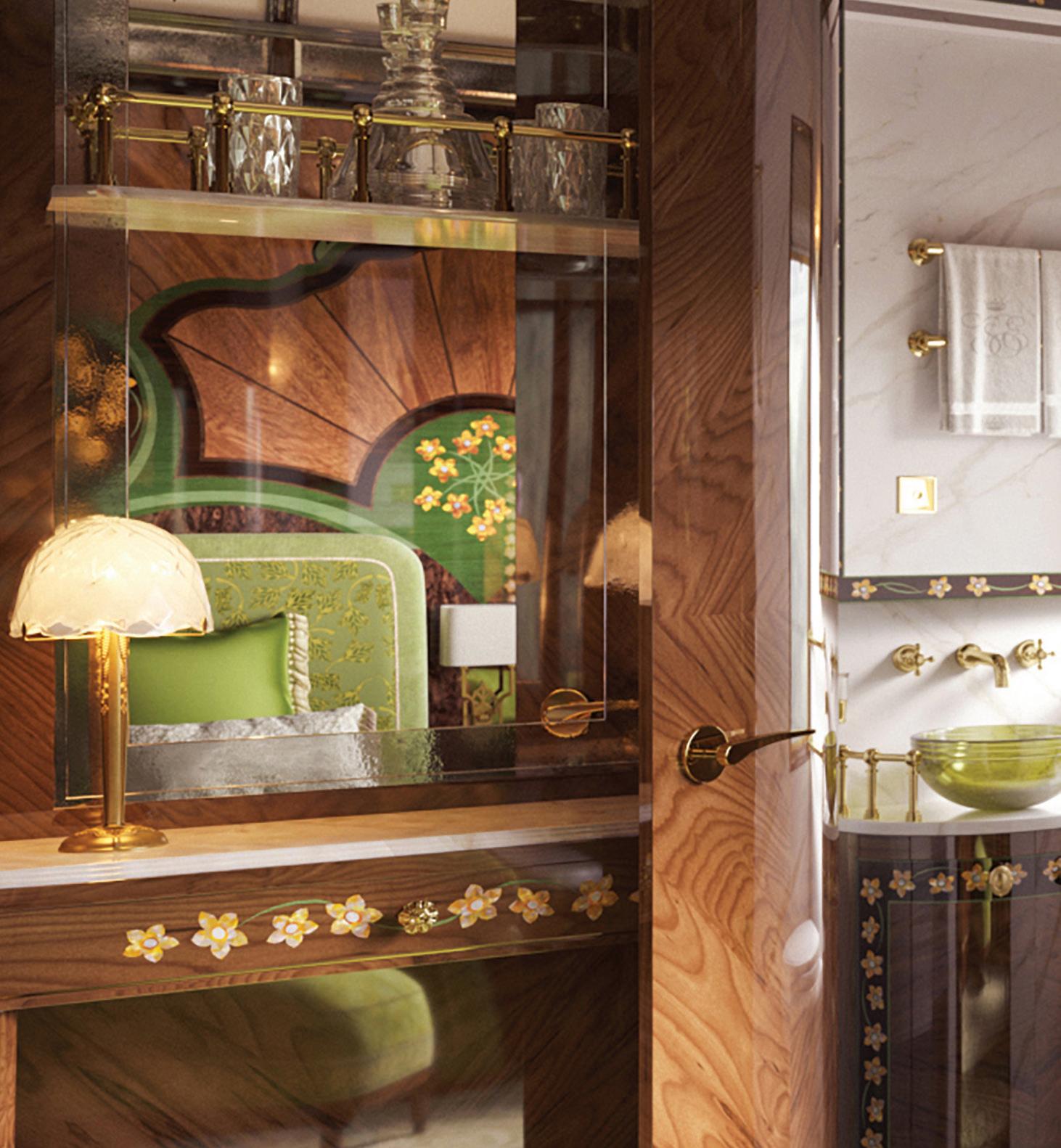 All aboard, left: Les Montagnes suite on the Venice Simplon-Orient-Express. Below and bottom left: Views and details in the La Campagne suite.