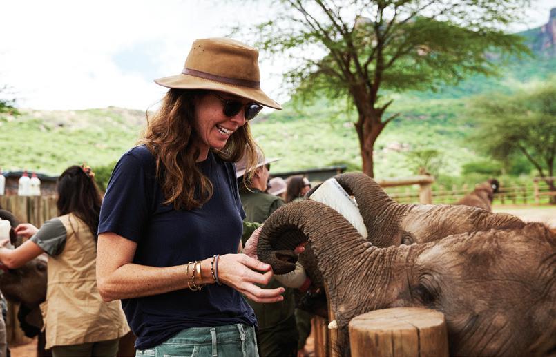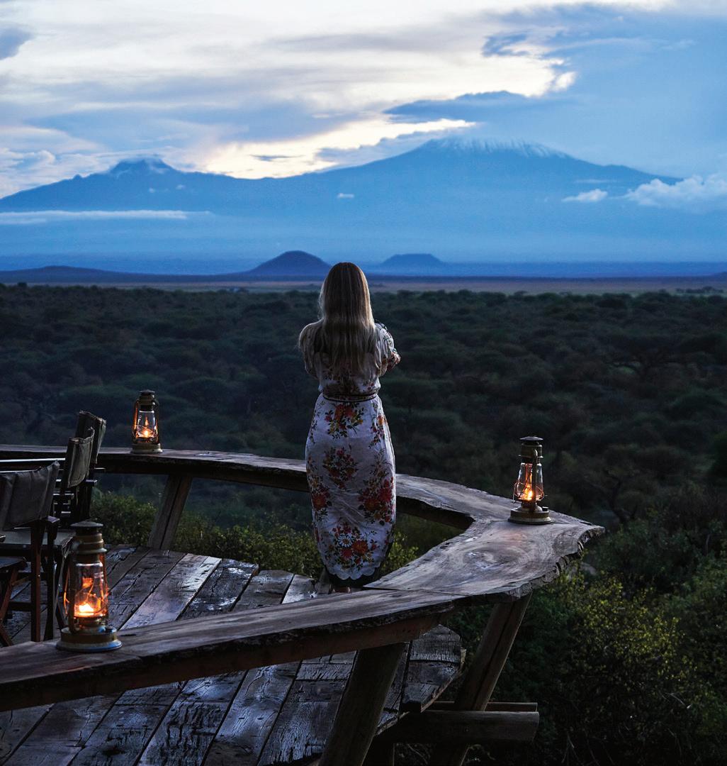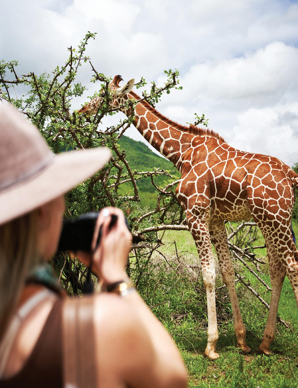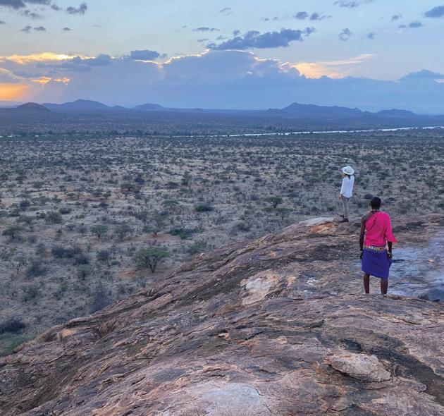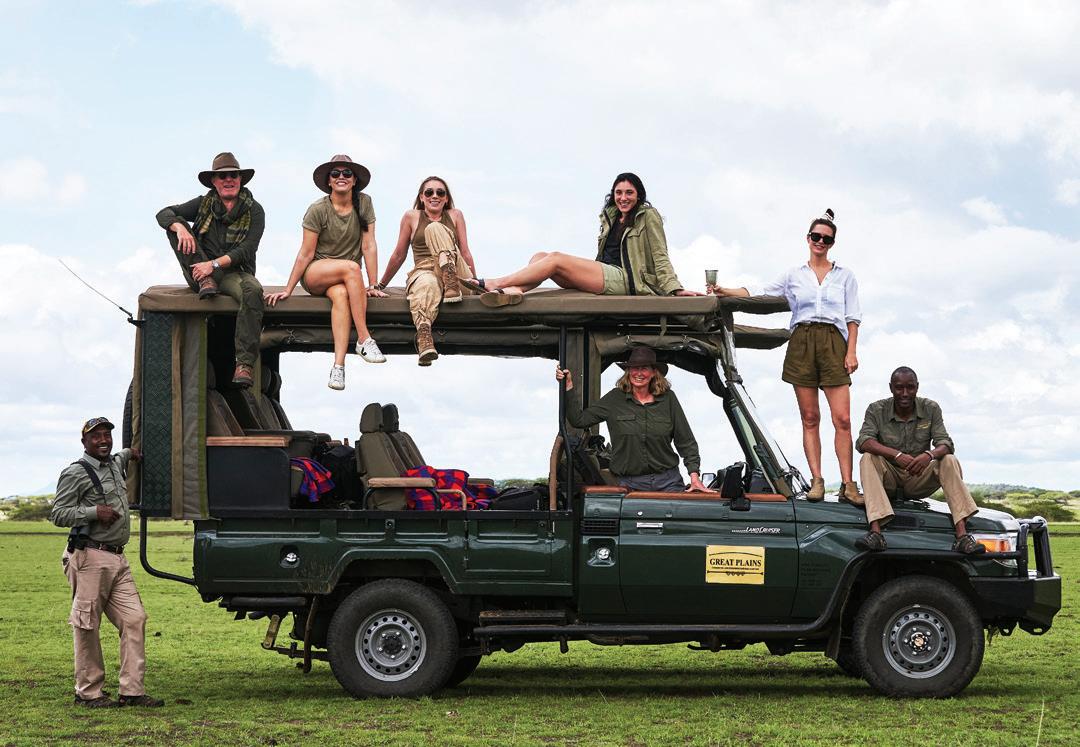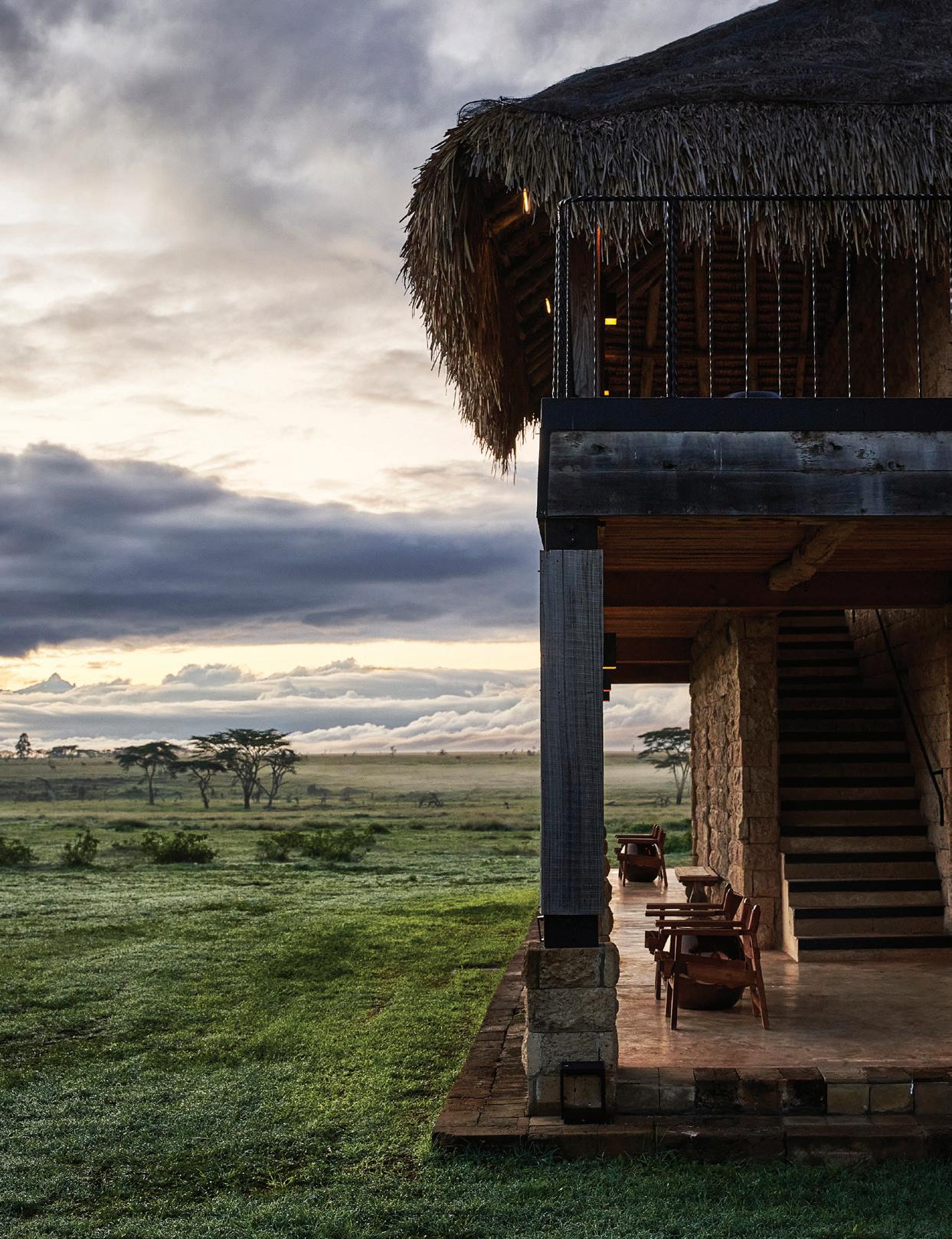 from dancing on the edge of danger as we freewheeled our way across the savanna, swigged Tusker beers on a cliff in Laikipia, helicoptered over charging rhinos with Tina Turner blasting on the radio and galloped on horseback through the green hills of Chyulu into a dazzle of zebras. I glowed in the warmth of my safari companions’ laughter, late into the night, and in the embrace of our exceptional Kenyan hosts. Over those days, we became a travel tribe—and I was reminded of the way we were meant to live: interconnected and in sync, with each other and the world around us. We bundle up when it rains and tell stories by the fire. We ask each other—“Are you afraid?” We surrender ourselves completely to the turnings of the planet. Maybe we’ll see a leopard, and maybe we won’t? We go to bed when it’s dark and we rise with the light.