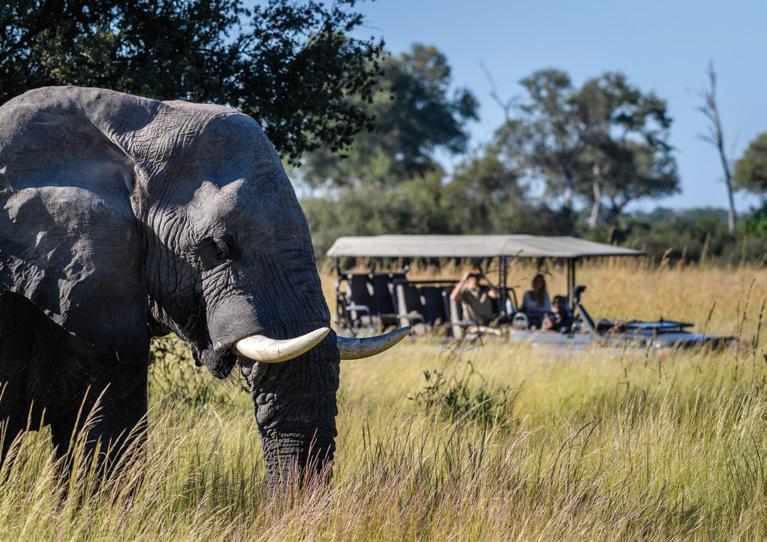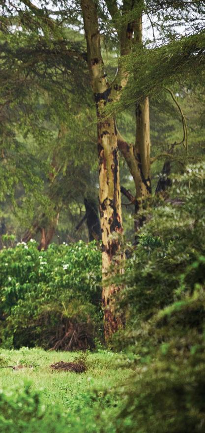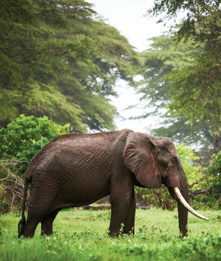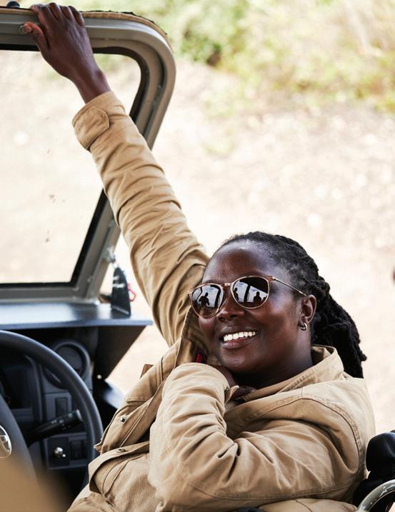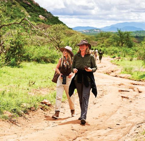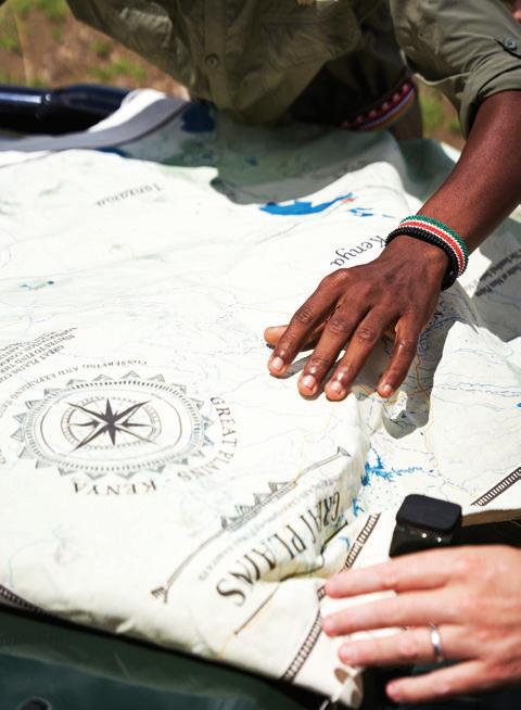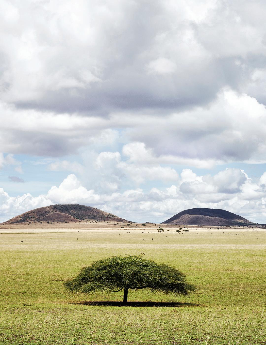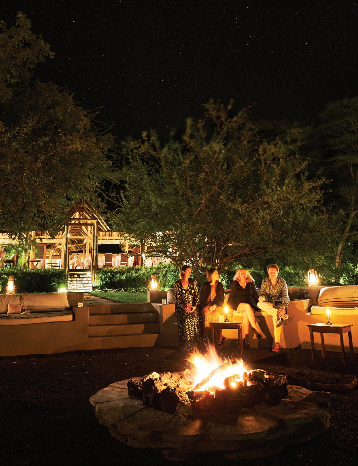 from dancing on the edge of danger as we freewheeled our way across the savanna, swigged Tusker beers on a cliff in Laikipia, helicoptered over charging rhinos with Tina Turner blasting on the radio and galloped on horseback through the green hills of Chyulu into a dazzle of zebras. I glowed in the warmth of my safari companions’ laughter, late into the night, and in the embrace of our exceptional Kenyan hosts. Over those days, we became a travel tribe—and I was reminded of the way we were meant to live: interconnected and in sync, with each other and the world around us. We bundle up when it rains and tell stories by the fire. We ask each other—“Are you afraid?” We surrender ourselves completely to the turnings of the planet. Maybe we’ll see a leopard, and maybe we won’t? We go to bed when it’s dark and we rise with the light.