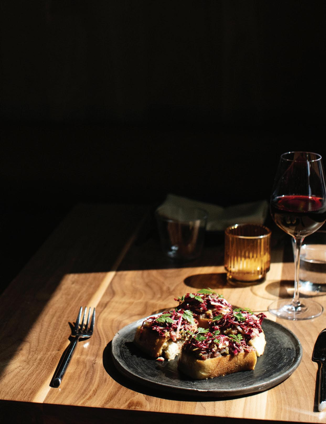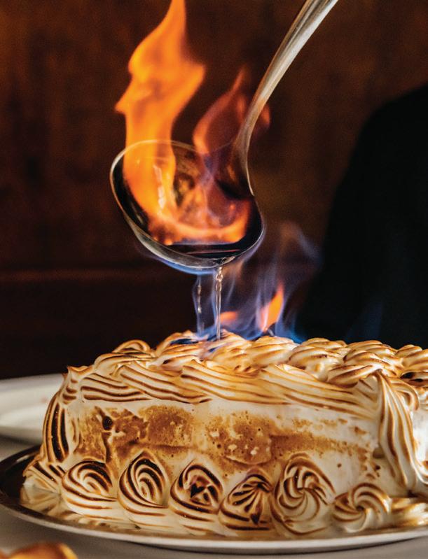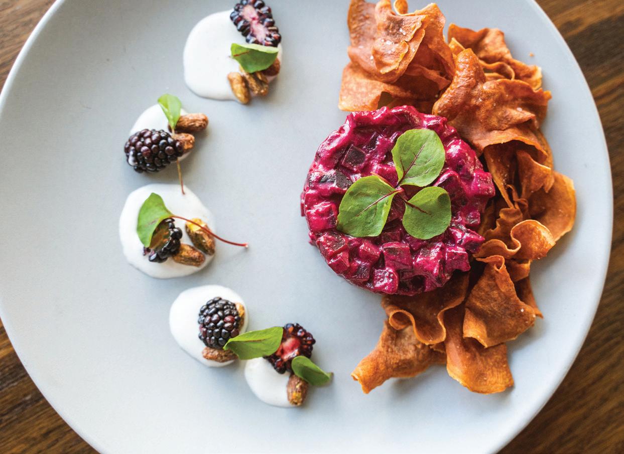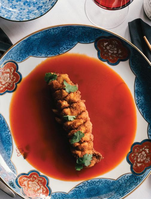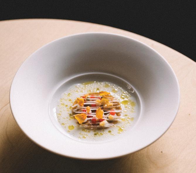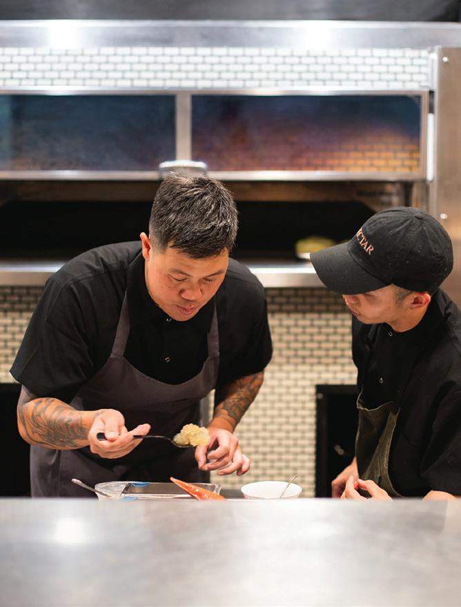 HE OTHER PORTLAND’S food and drink scene is fueled by a reverence for quality and craftsmanship. “We are a strong community of farm-loving makers who create magic from scraps,” says James Beard Award–winning chef Gregory Gourdet, of live-fire Haitian restaurant Kann and pan-Caribbean bar Sousòl. “From pop-ups, food carts and fun fine dining, ‘do it ourselves’ is and always will be our ethos.” Everything from the coffee roasters to the food carts (500-plus options with dishes from Filipino spaghetti to shrimp dumplings) is approached with a hyperlocal, artisanal eye. Olympia Provisions, the first USDA-approved salumeria in Oregon, opened in 2009 and continues to raise the bar with its commitment to sourcing 100 percent humanely raised pork from the Pacific Northwest. The family-run charcuterie business has turned into a mini empire of European-inspired restaurants, including Bar Casa Vale, a Spanish-influenced tapas bar, and most recently Alpenrausch, which transports diners to the Alps with fondue, schnitzel and natural wines. Thai chef Akkapong “Earl” Ninsom uses the flavors of home and products of the Pacific Northwest as muses for his growing network of Portland restaurants, which include tasting-menu destination Langbaan; fried-chicken spot Hat Yai; Thai barbecue joint Eem; Phuket Café, known for wild creations like peanut-brittle-topped ceviche; and the latest, Yaowarat, a Thai Chinese restaurant that channels the food of Bangkok’s Chinatown (think garlic-slathered grilled squid and bean curd dumplings). The city’s talent runs deep. Some, like Jin Caldwell and Kyurim Lee, the Korean-born duo serving pink lemonade bonbons and flaky almond croissants at newcomer JinJu Patisserie, cut their teeth at Michelin-star restaurants. Others, like acclaimed pizzaiola Sarah Minnick, are self-taught. The sourdough pies she turns out at Lovely’s Fifty Fifty are like love letters to the Pacific Northwest, made with Camas Country Mill flours and topped with ingredients sourced from local farmers and foragers.