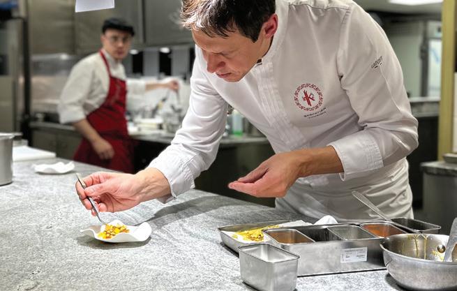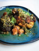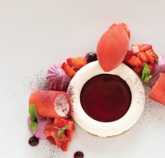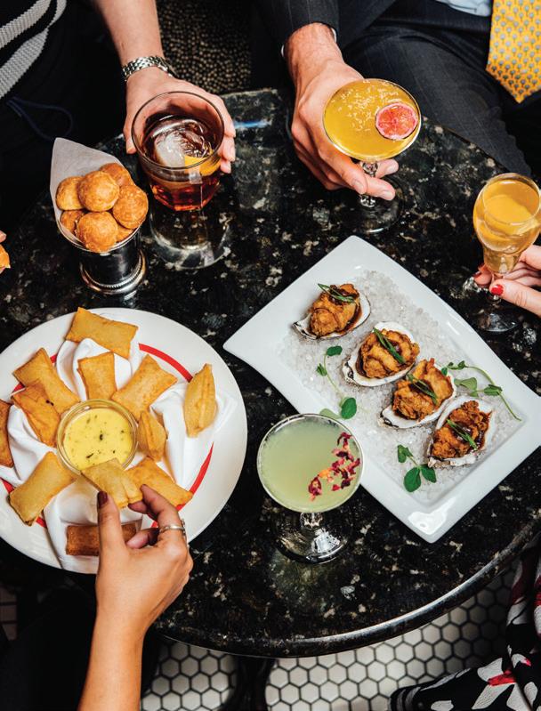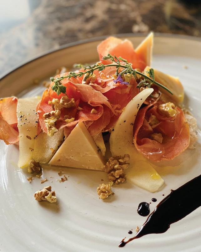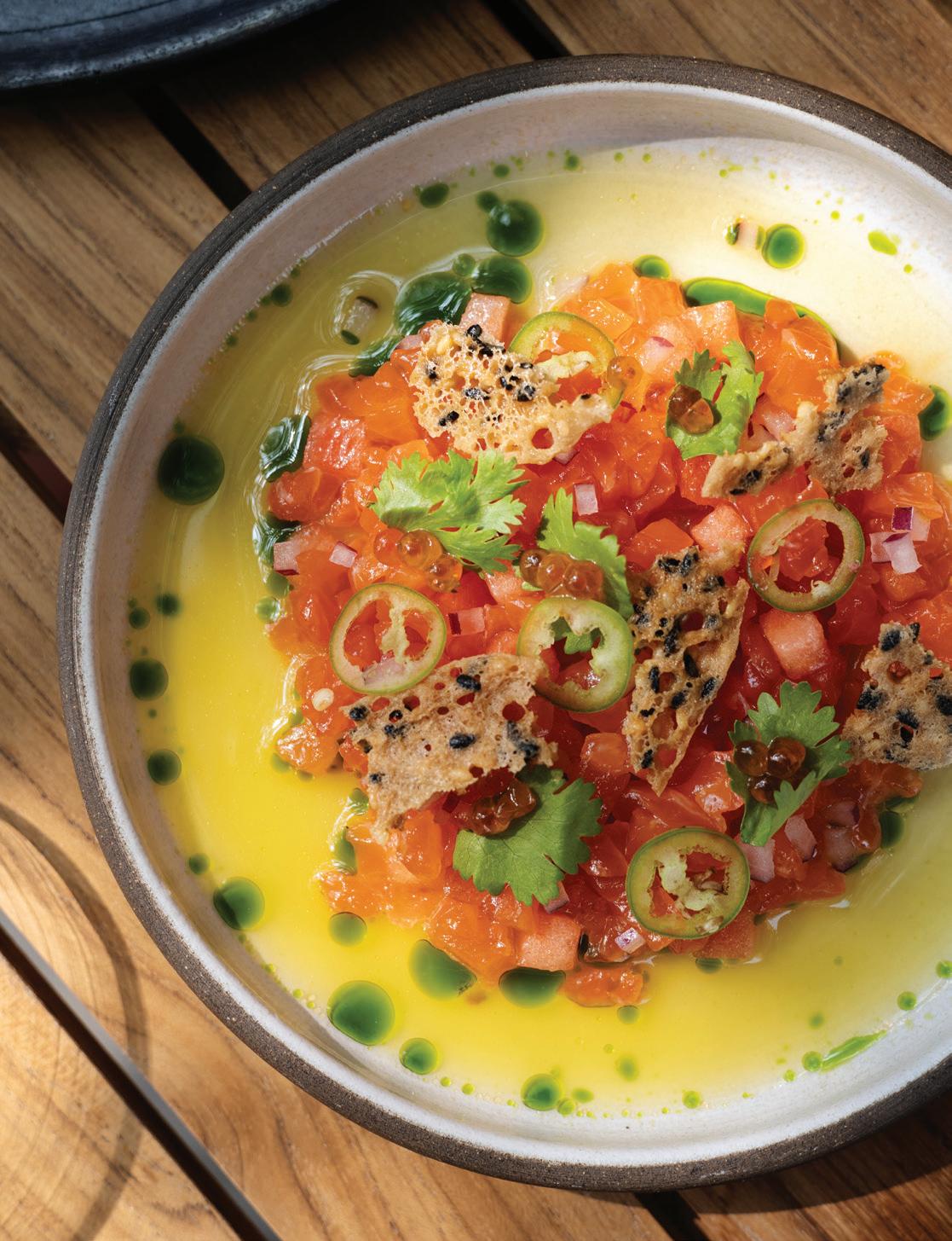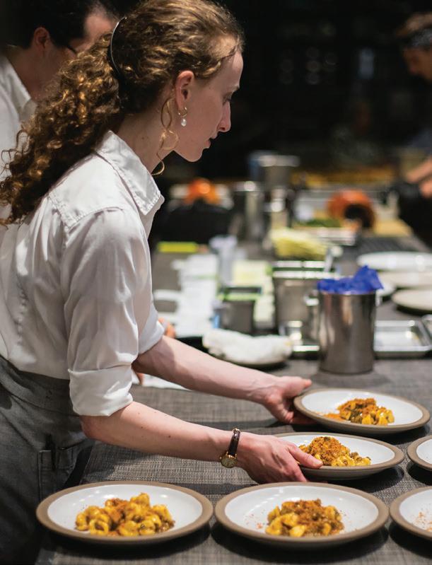 HE OTHER PORTLAND’S food and drink scene is fueled by a reverence for quality and craftsmanship. “We are a strong community of farm-loving makers who create magic from scraps,” says James Beard Award–winning chef Gregory Gourdet, of live-fire Haitian restaurant Kann and pan-Caribbean bar Sousòl. “From pop-ups, food carts and fun fine dining, ‘do it ourselves’ is and always will be our ethos.” Everything from the coffee roasters to the food carts (500-plus options with dishes from Filipino spaghetti to shrimp dumplings) is approached with a hyperlocal, artisanal eye. Olympia Provisions, the first USDA-approved salumeria in Oregon, opened in 2009 and continues to raise the bar with its commitment to sourcing 100 percent humanely raised pork from the Pacific Northwest. The family-run charcuterie business has turned into a mini empire of European-inspired restaurants, including Bar Casa Vale, a Spanish-influenced tapas bar, and most recently Alpenrausch, which transports diners to the Alps with fondue, schnitzel and natural wines. Thai chef Akkapong “Earl” Ninsom uses the flavors of home and products of the Pacific Northwest as muses for his growing network of Portland restaurants, which include tasting-menu destination Langbaan; fried-chicken spot Hat Yai; Thai barbecue joint Eem; Phuket Café, known for wild creations like peanut-brittle-topped ceviche; and the latest, Yaowarat, a Thai Chinese restaurant that channels the food of Bangkok’s Chinatown (think garlic-slathered grilled squid and bean curd dumplings). The city’s talent runs deep. Some, like Jin Caldwell and Kyurim Lee, the Korean-born duo serving pink lemonade bonbons and flaky almond croissants at newcomer JinJu Patisserie, cut their teeth at Michelin-star restaurants. Others, like acclaimed pizzaiola Sarah Minnick, are self-taught. The sourdough pies she turns out at Lovely’s Fifty Fifty are like love letters to the Pacific Northwest, made with Camas Country Mill flours and topped with ingredients sourced from local farmers and foragers.