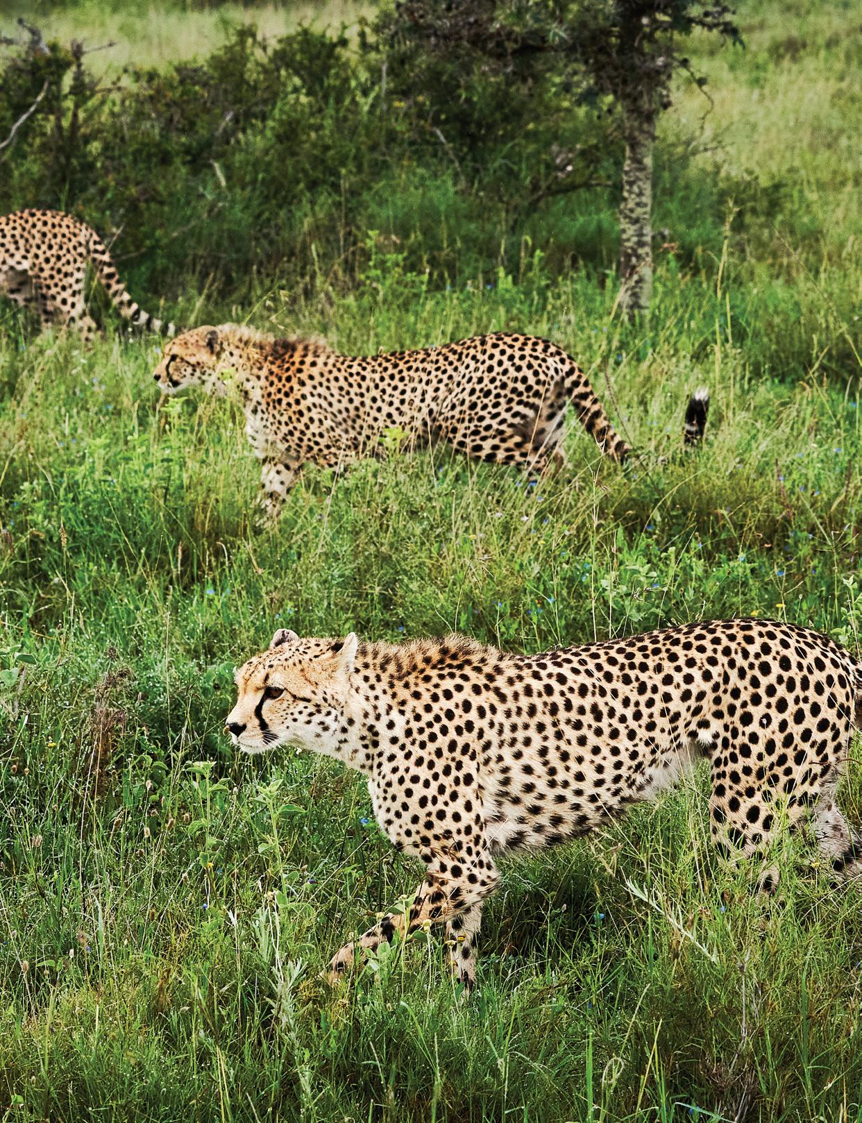 A mother cheetah and her two sons on the hunt on the reserve at Segera in Laikipia.