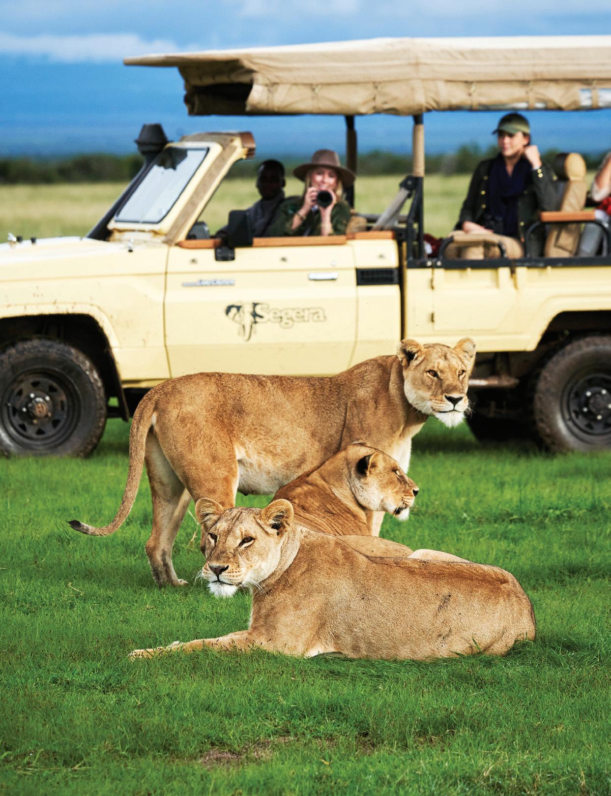 Lionesses prepare for a hunt on the reserve at Segera in Kenya. Opposite, from left: An oxpecker hitches a ride on a giraffe; Matthew, a Maasai warrior guide at Finch Hattons Camp.