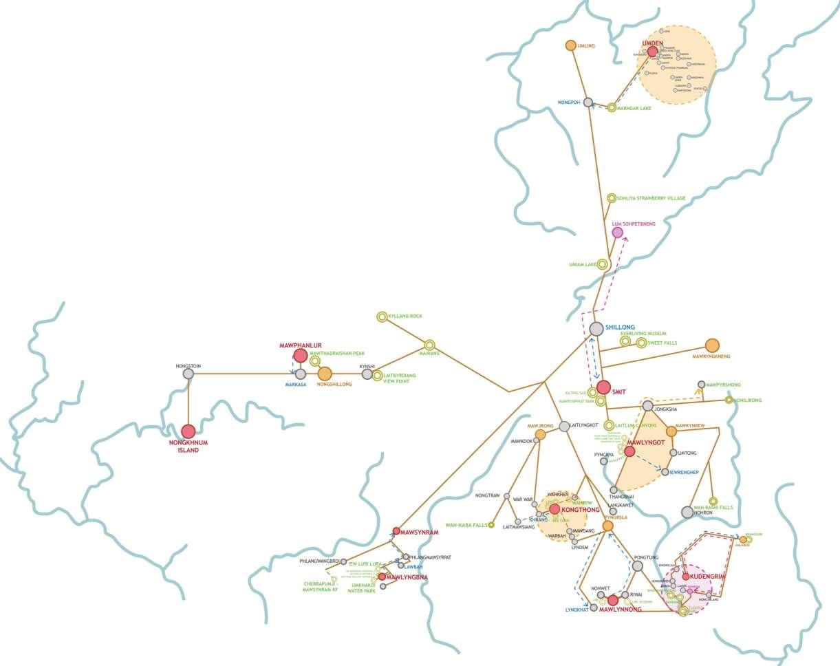 The study began by looking at the region around the state of Meghalaya. A historical understanding was developed to understand the evolutionary pattern and cultural characteristics of the region. The topography, hydrology, forest cover and access to public amenities were collated, mapped spatially and analysed.