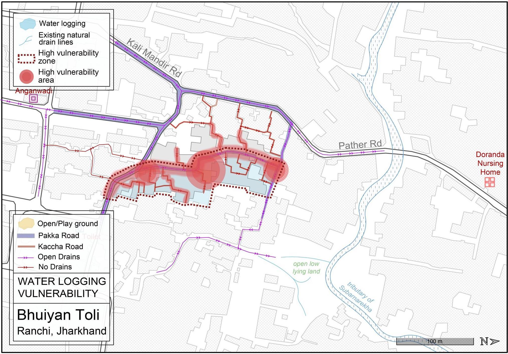 A second challenge is that of translating experiential boundaries into spatial boundaries. For example, while assessing vulnerabilities related to water logging or water scarcity, it was essential that spatial demarcation of the vulnerable areas was not interpreted as static zones but as fluid lines subject to the influence of temporal variations and socio-ecological conditions. While a particular area can appear as water-logged, this is subject to change and it does not preclude the possible vulnerability of currently non-vulnerable areas to water logging so long as the fundamental insufficiencies in drainage infrastructure remain unresolved. Incorporating an experiential understanding of physical distance also emerged as critical while understanding access to social and physical infrastructure. A distance of 1 km between a hospital and the settlement can be variedly interpreted as adequate or inadequate, depending on