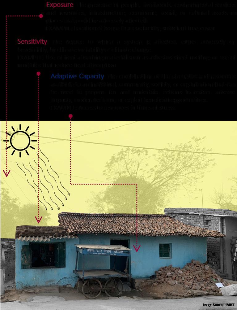 EXPOSURE: Heat stress has increased in the last 10 years ago since agricultural land has been converted for residential use and tree cover has reduced. Housing condition is poor with 80% of the houses being largely of the semi-pakka type. 80% houses have heat reflecting asbestos roofing.