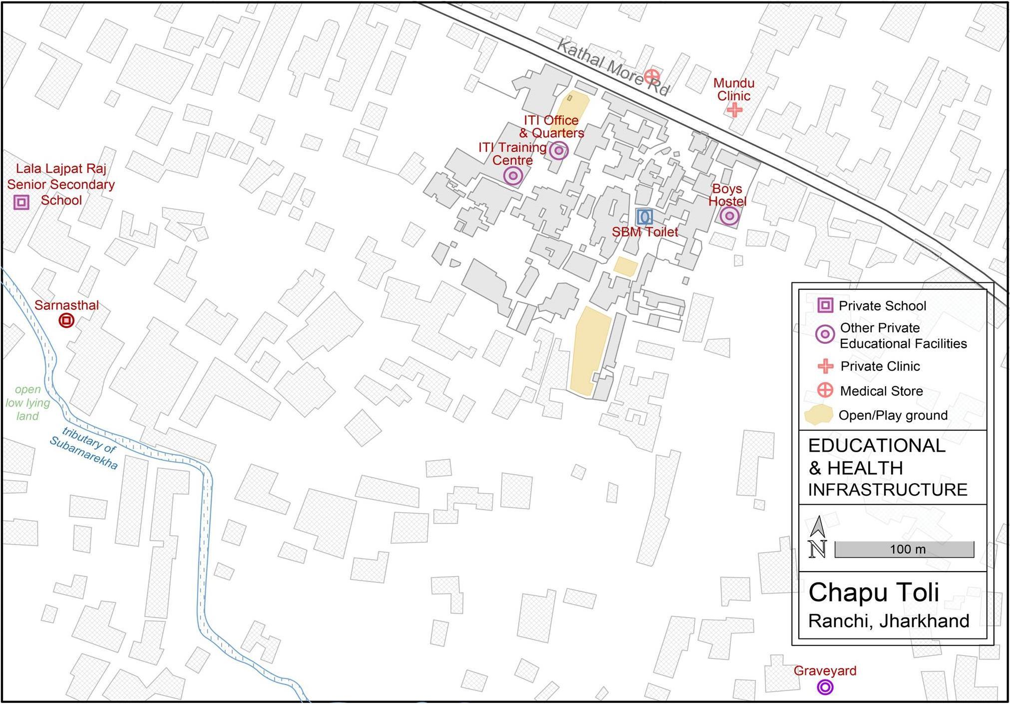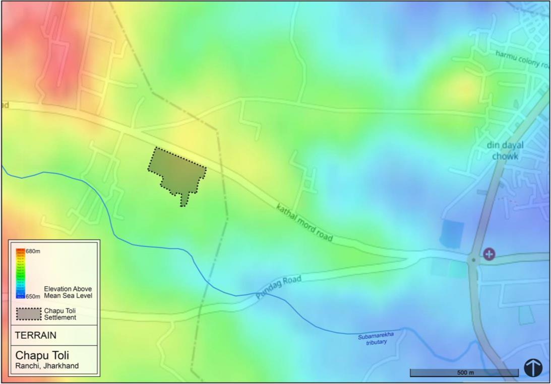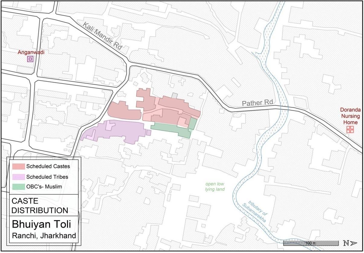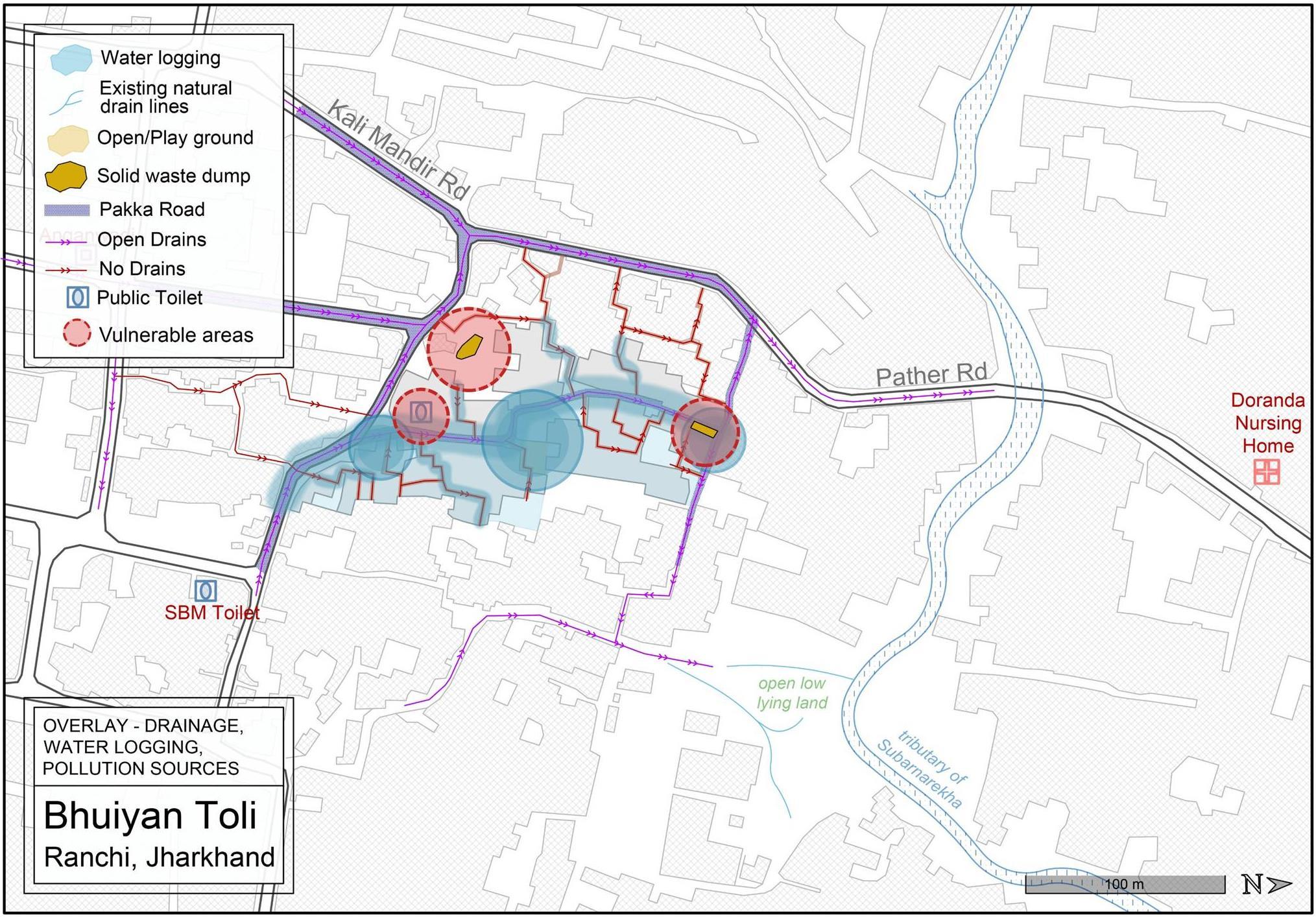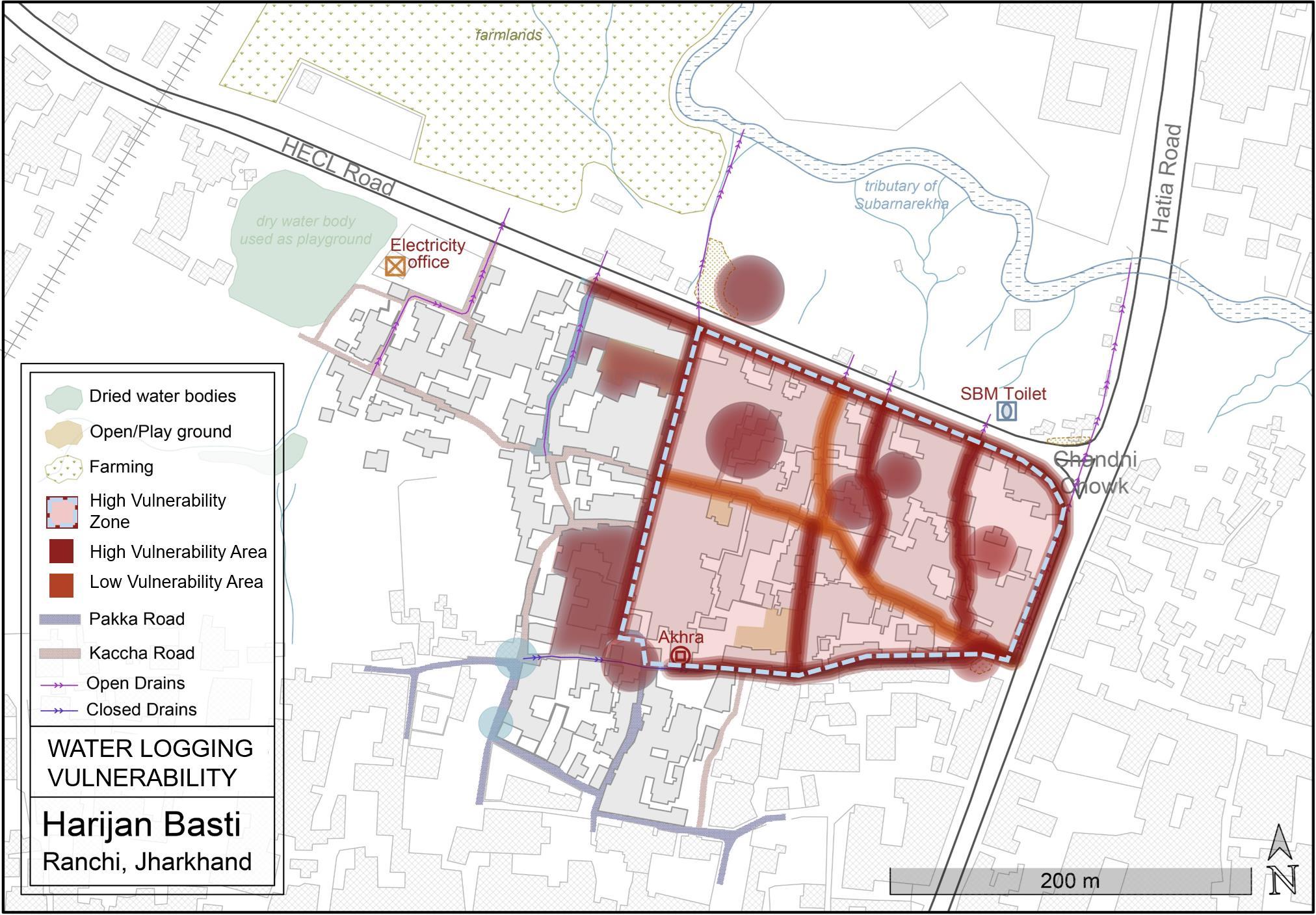 This report focuses primarily on the spatialisation of the data that emerged from a detailed primary engagement conducted by Mahila Housing SEWA Trust (MHT) in the three settlements of Ranchi. Integrated Design acknowledges the efforts of the MHT teams at Ahmedabad and Ranchi in facilitating the extensive field work without which the assessment and mapping of vulnerabilities would not have been possible. We also acknowledge the participation and corporation of the communities in Harijan Basti, Bhuiyan Toli and Chapu Toli in facilitating our study.