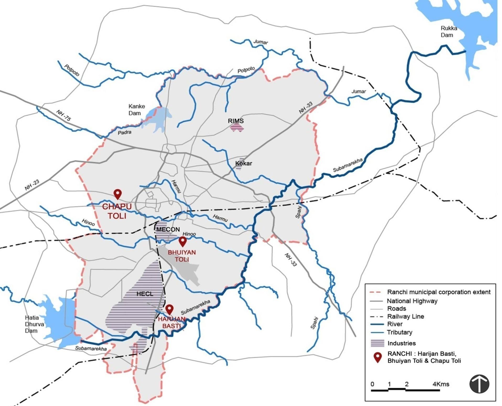 Once a settlement of Munda and Oraon tribes, the city of Ranchi is an emerging industrial metropolis of 1.07 million.While being one of the fastest growing urban areas with anindustrially propelledeconomy the city lacks basic services and stands environmentally compromised. Officially, Ranchi city has 254 slums supporting 30 % of the city’s population. These are largely erstwhile tribal villages that were gradually engulfed by the city, creating city pockets that maintain village-like character. Their classification as ‘slums’exacerbates their vulnerabilities. They are accorded the least priority in formal planning, governance institutions especially with regards to service provision.