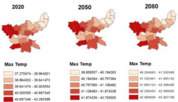Image: Maximum Temperature (°C) in Jharkhand under A2b scenario of IPCC assessment report. The summer temperature will go up by a max of 2.30-3.00 between 2020-2080