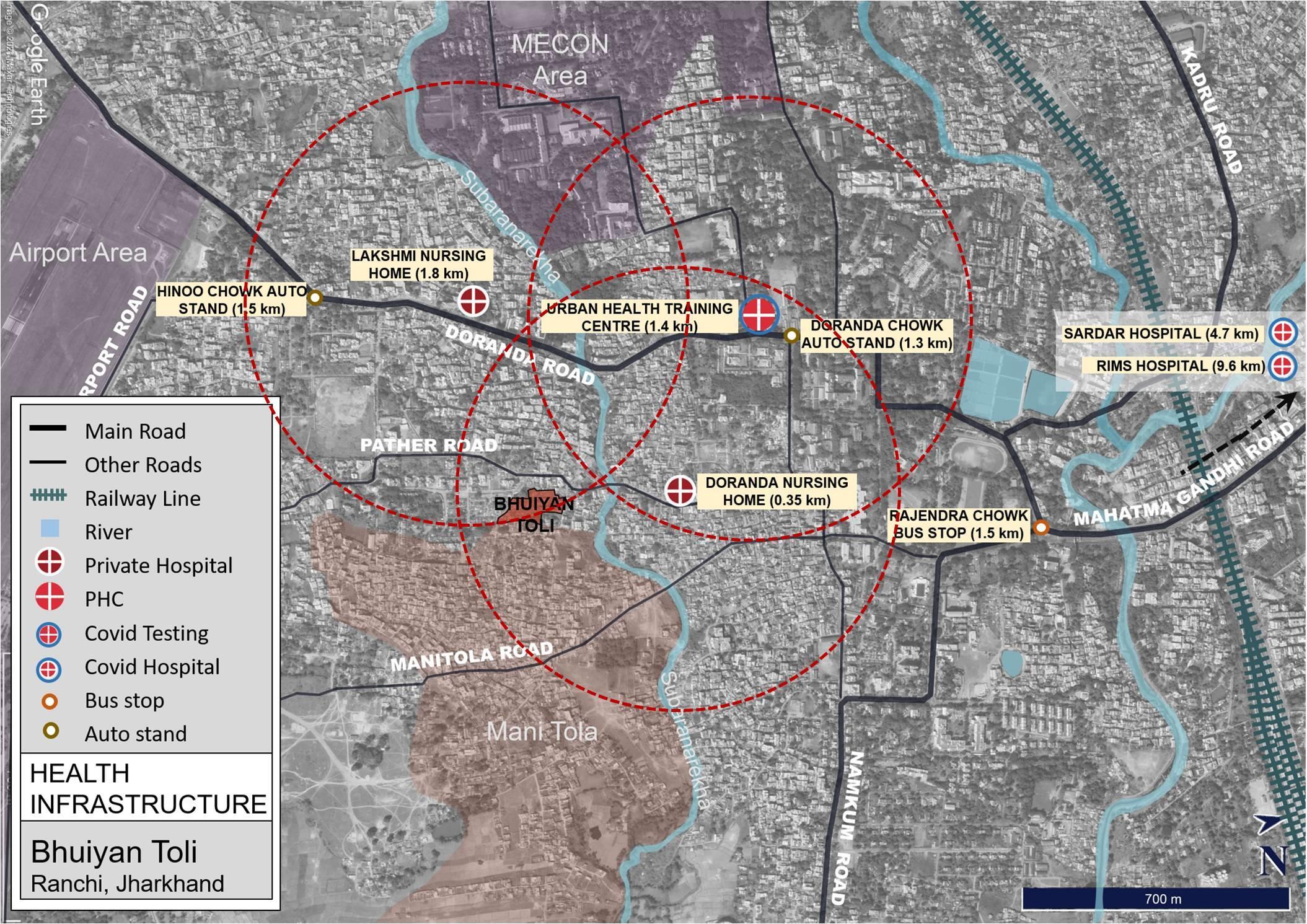 ‘Vulnerability Assessment of Urban Informal Settlements in Ranchi’ prepared by MHT and Integrated Design dominantly engaged with the former objective highlighting the context-specific manifestation of climate change vulnerabilities (as derived from FGDs, social mapping, geo-spatial mapping and HH surveys). The project report shall build on those insights while explicitly focussing on the latter objective of deriving processes for bottom-up data collection and their integration into planning frameworks.