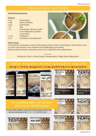 Zubereitung Die Erdnüsse, Sesamsamen und die Kokosraspel einzeln in dieser Reihenfolge in einer Pfanne trocken rösten und einzeln in einer Moulinex oder Kaffemühle grob mahlen. Mit den anderen Zutaten vermischen und in einer luftdichten Dose aufbewahren. »»»»»»»» Verfasserin: Frau Dr. Veena També, Atmasantulana, Village Karla, Maharashtra