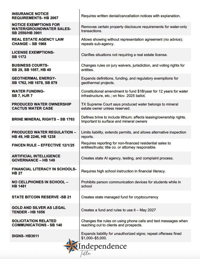 • The Governor vetoed SB 1253, but it passed with minor changes in the second special session as SB 14. SB 14 provides for credits against impact fees for developers, for including water conservation features or reduced use or reuse of wastewater. This new law is effective January 1, 2026.