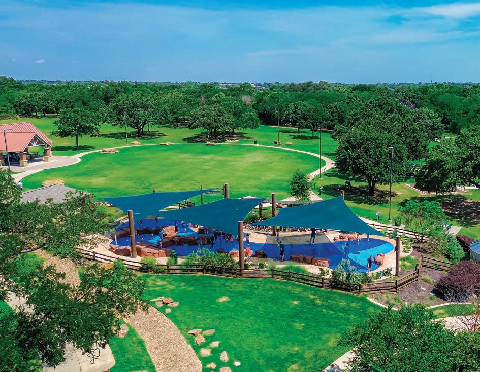 A modern park with a shaded splash pad, nature-themed playground, full-sized basketball court, fitness equipment, pavilion, picnic tables, grills, restrooms, and multi-use trails. It’s perfect for active families and group gatherings. 6425 Stonecrest Rd | Flower Mound | 972-874-6300 flowermound.gov/2613/Canyon-Falls-Park