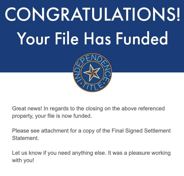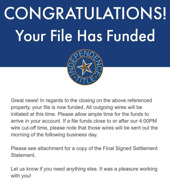 Independence Title will send signed docs to the lender Once received, the lender will give funding approval.