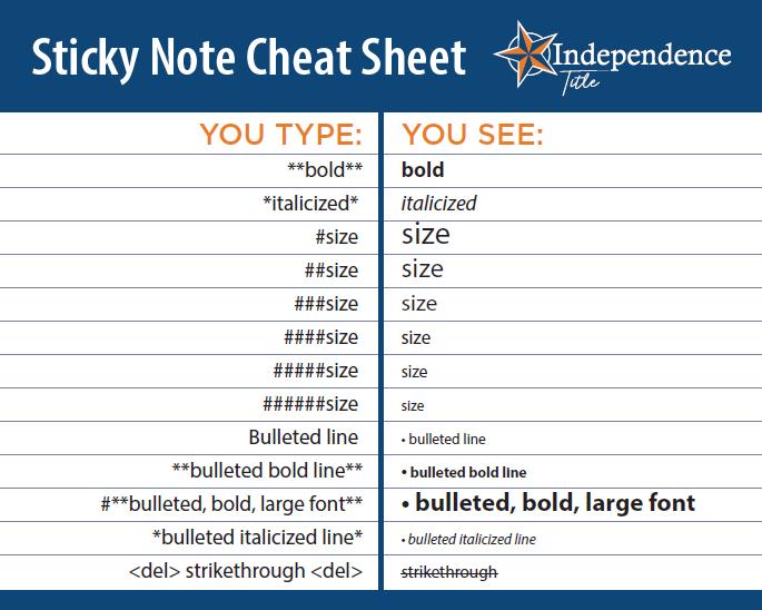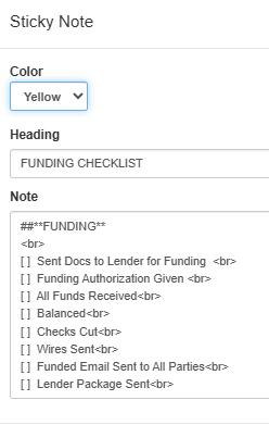 If you want to create a template for a sticky note to pull through into all orders, simply format the sticky note in the order base that you use This can be done in the closing application by going to “Applications” and clicking on “Order Bases.” Find the base that you use for your orders and select “Base Dashboard.” If you make a template on this screen and select “save changes,” every sticky note in new orders for that base will have the template created. See below for a sample template.