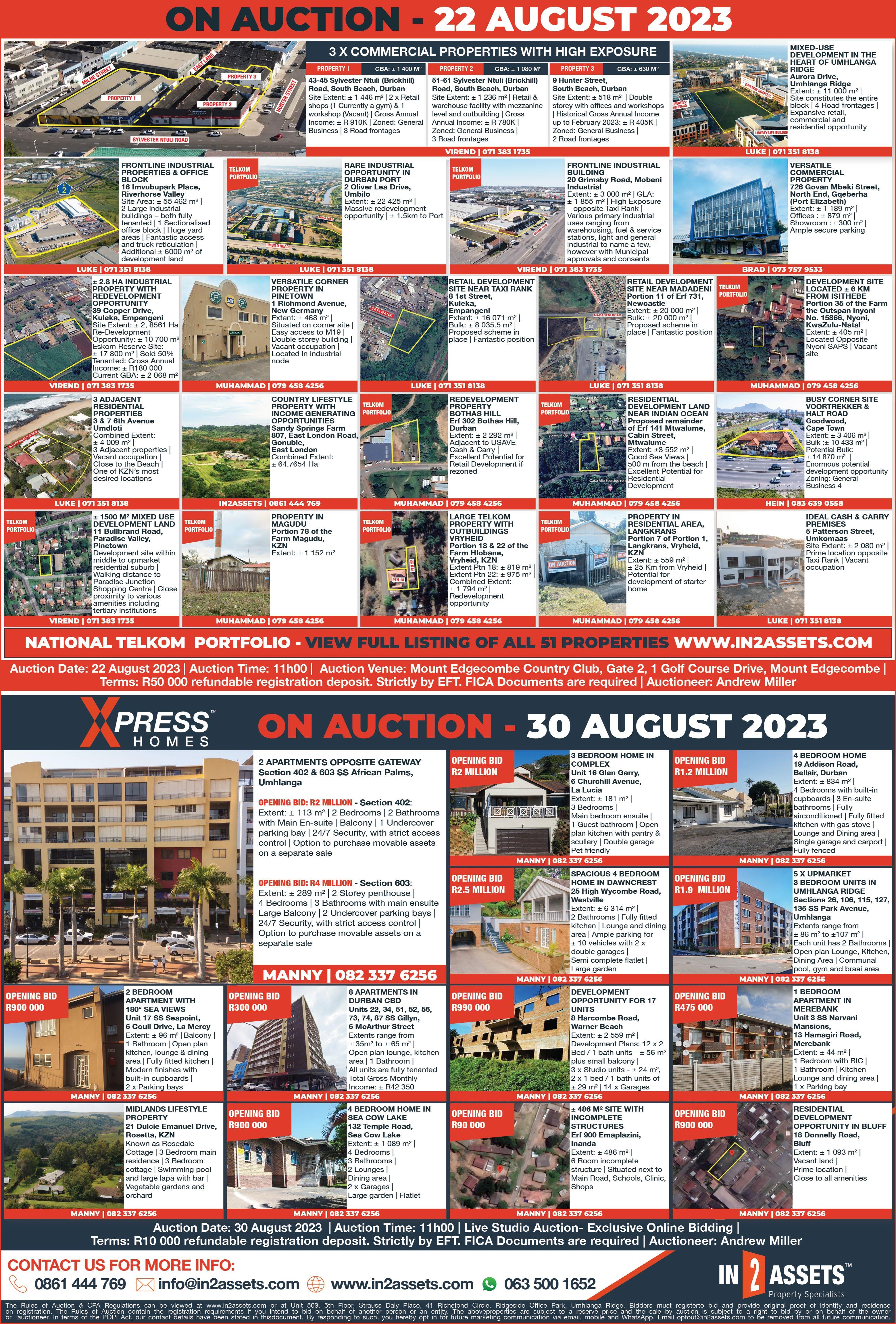 Contact Danielle Hoskins (Candidate Property Practitioner l Registered with the PPRA) on 082 801 6827 / 033 397 1190 • R50 000 buyer's card deposit payable by EFT • 10% deposit on purchase price payable by successful bidder on fall of hammer • FICA to be provided • “Above subject to change without prior notice • Sale subject to confirmation (E&OE)