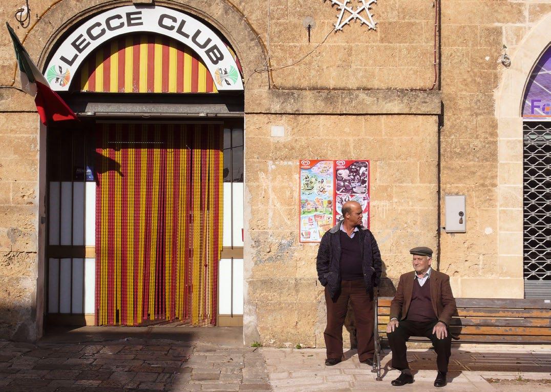 ABOVE | T wo men sIT ouTsIde The Lecce cLub, named af Ter The reGIonaL caPITaL In souThern ITaLy, every Town has ITs socIaL cLub for men. Opp OsitE lEft | e asTer sees GaLLIP oLI hosTInG ProcessIons ThaT meander Throu Gh The sTreeTs of The oLd Town unTIL The smaLL hours. Opp OsitE cEntrE | a characTerIsTIc Pu GLIan baroque church In The hIsTorIc cenTre of nard Ò Opp OsitE right | a T yPIcaL narrow medIevaL sTreeT In The hearT of GaLLIP oLI