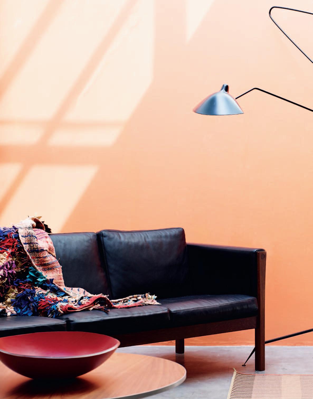 From left to right: ch 163 s ofa in leather designed by Hans J Wegner in 1965 for Carl Hansen & Sons. b oucherouite vintage rug by Hay. a J pedestal coffee table in Walnut designed by Arne Jacobsen in 1968 for Fritz Hansen. atelier bowl in leather by Poltrona Frau. t wo ways rug in orange coated paper designed by Merete Erbou Laurent for Hay. l a mpadaire 3-arm floor lamp in black designed by Serge Mouille in 1950. c or ona chair with wooden base designed by Poul M. Volther in 1961 for Erik Jorgensen. ad net rectangulaire mirror designed by Jacques Adnet for Gubi.