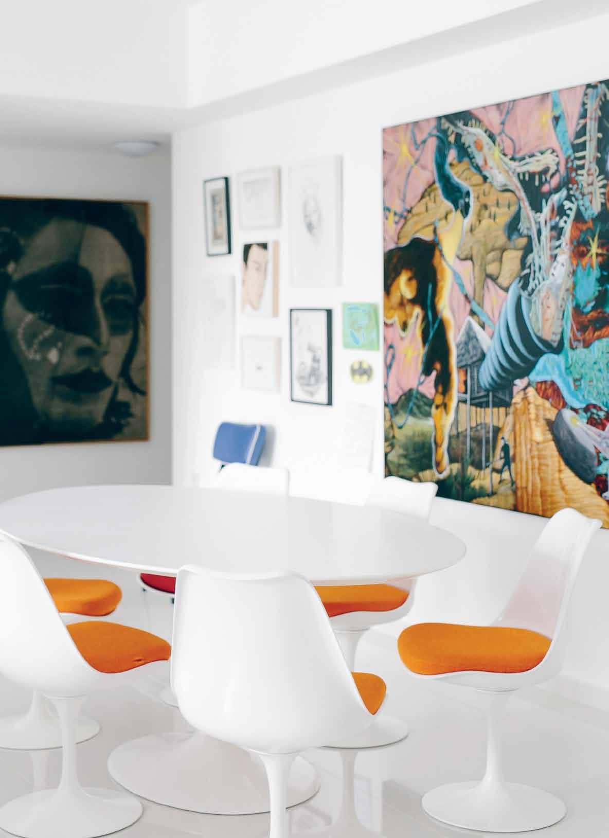 The furniture inside is a cosmopolitan blend of classic and found pieces.