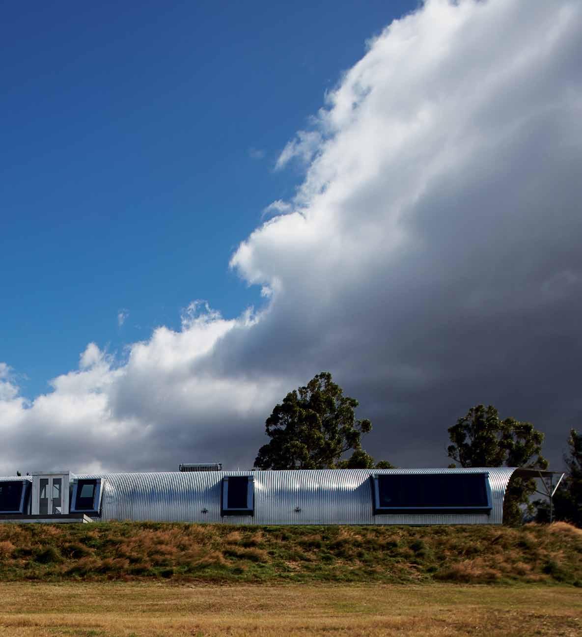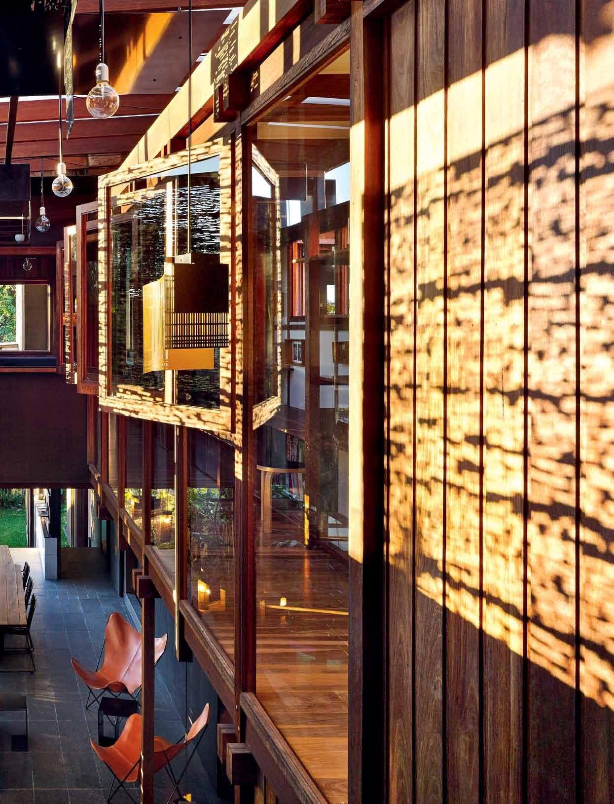 One major change came in the form of a giant wind-up door made in lightweight balsa with a hardwood outer casing. Opening up much of the western wall via a series of cables and a manualwinding mechanism located inside, the door was conceived by Bohane and designed by Temple. Chiefly incorporated to provide better airflow and open the space to late afternoon sun in winter, it also allows large gatherings to spill out onto the adjacent lawn when required.