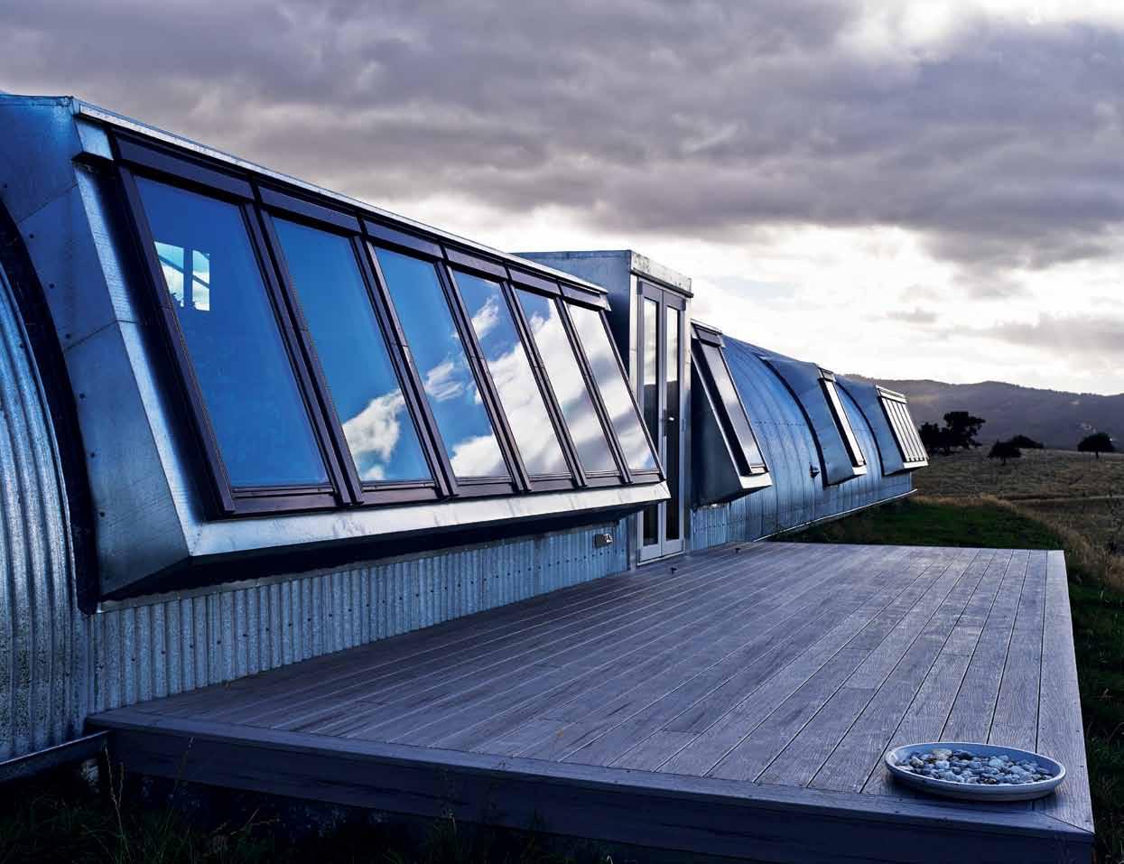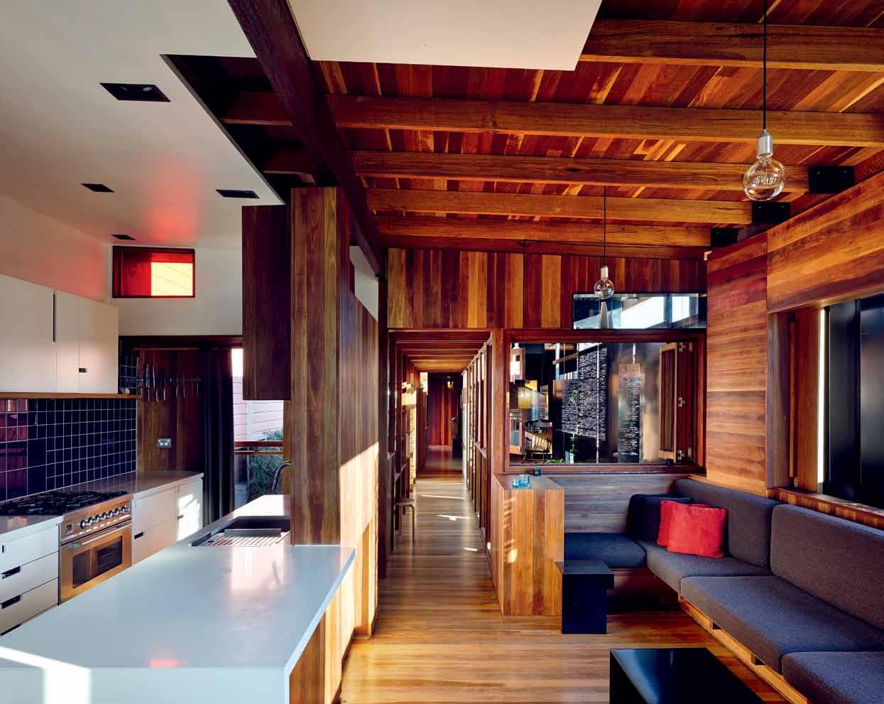 details and handles in ancient Murray River red gum. Raw cypress pine to walls, overlapped formply to ceiling. Bronze and copper guttering and exposed plumbing by builder. Sliding doors in New Guinea rosewood. Decking boards in blackbutt. Door has balsa wood core with hardwood timber veneer. Stainless steel cables to winder mechanism.