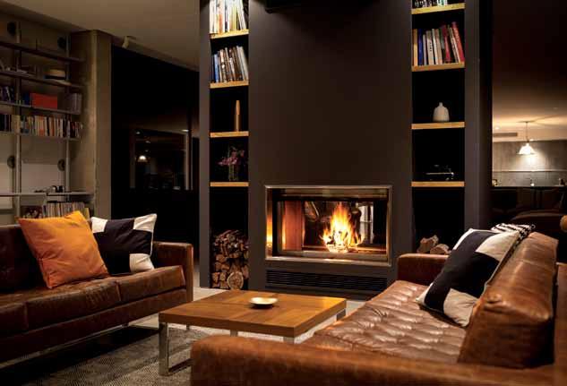 double-sided fireplace from The Heat Shop. Modric 2505 door hardware from Allgoods (UK). Siemens and Smeg kitchen appliances. Westinghouse refrigerator. Kado Lux WCs and white stone Hox basins from Reece. Sussex Pol tapware and Sussex Monsoon outdoor shower, also from Reece.