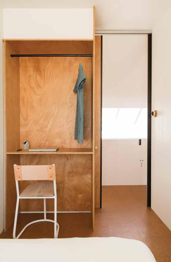 previous | TH e gener A lly spA rTA n look is TeM pered by TH e sof T lusTre of TH e n AT ur A l MATeriA ls. TH e kiTc H en joinery is MA de fro M forM ply bu T incorpor ATes HA nd s HA ped AncienT Murr Ay river red gu M HA ndles. A bove | looking pA sT A pA ir of vinTAge s pA nis H c HA irs by b ørge Mogensen To TH e je TT y A nd bAy beyond. TH e ceiling is lined in overl A pped forM ply, TH e wA lls in cypress pine – c H osen for iTs A nTi-w H iTe A nT properTies A nd ric H scenT