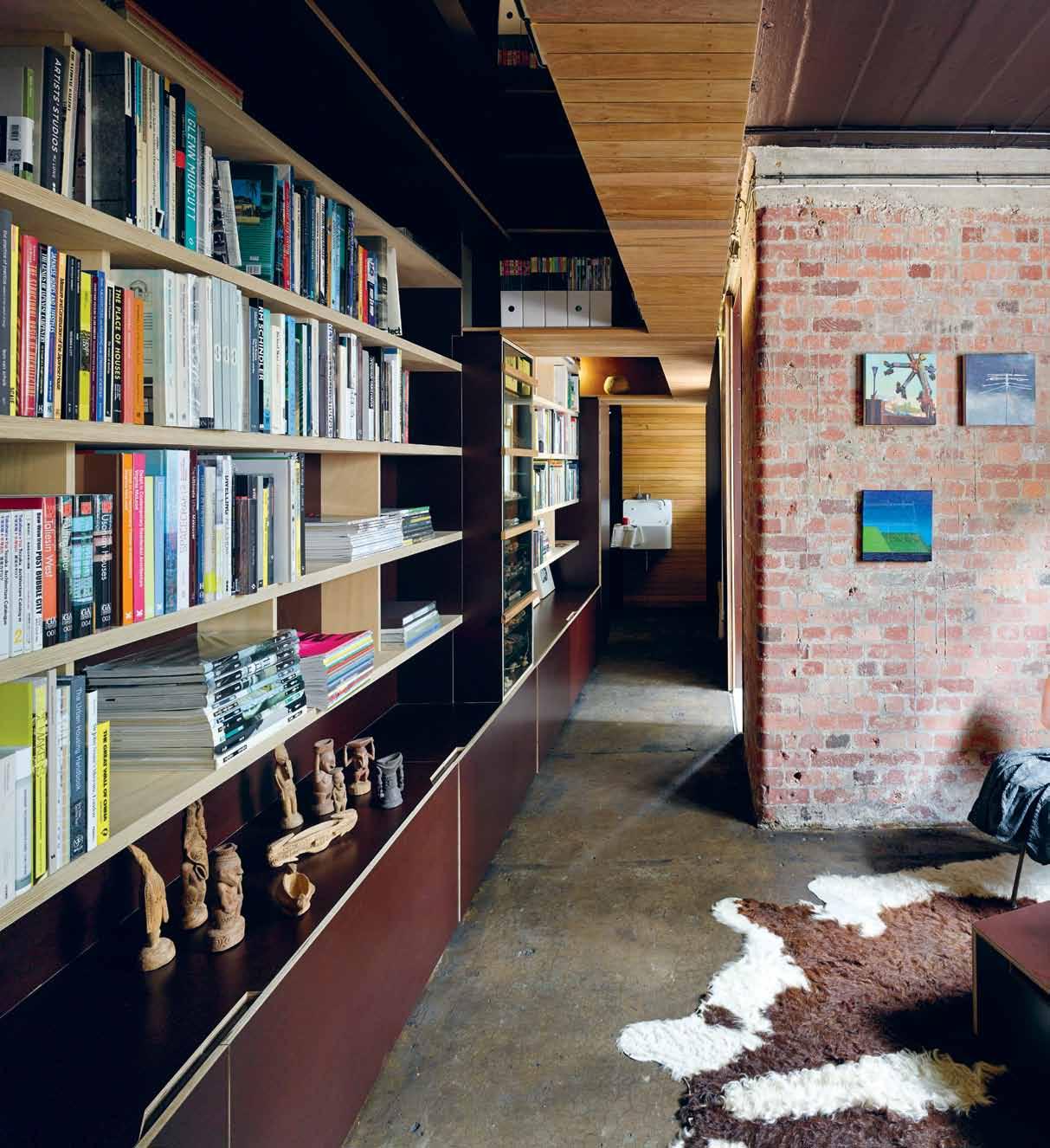 above | The use of a reduced pale TTe of maTerials - and in Their raw sTaTe - conTribu Tes To The sense of calm. opposite | Thin paTinaTed brass shee T selecTed for The expansive joinery wall adds Tex T ure and a “beau Tiful glow” To The space.