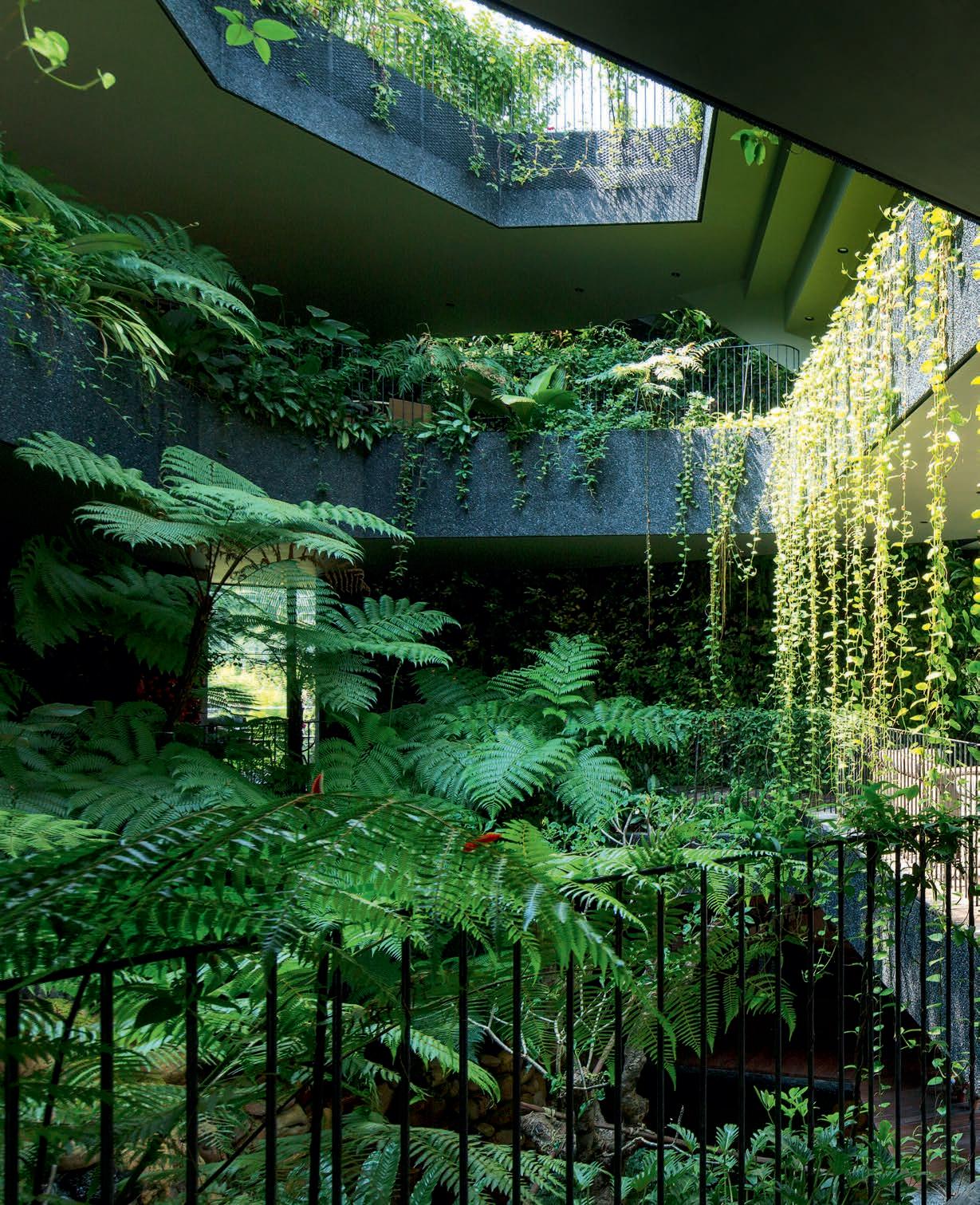A bungalow-style home built in a U-shape around a central courtyard in Singapore is the home of two doting parents and their three adult children. Cascading greenery, a flowing waterfall and a koi pond are a daily dose of nature.
