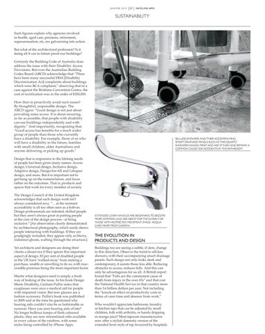 Such figures explain why agencies involved in health, aged care, pensions, retirement, superannuation, etc, are galvanising into action. But what of the architectural profession? Is it doing all it can to future proof our buildings? Certainly the Building Code of Australia does address the issue with their Disability Access Provisions. But even the Australian Building Codes Board (ABCD) acknowledge that “There have been many successful DDA [Disability Discrimination Act] complaints about buildings which were BCA compliant,” observing that in a case against the Brisbane Convention Centre, the cost of rectification was in the order of $300,000. How then to proactively avoid such issues? By thoughtful, responsible design. The ABCD again: “Good design is not just about providing some access. It is about ensuring, as far as possible, that people with disability can use buildings independently and with dignity.” And importantly, recognising that, “Good access has benefits for a much wider group of people than those who currently have a disability. For example, those of us who will have a disability in the future, families with small children, older Australians and anyone delivering or picking up goods.”