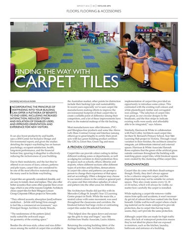 the Australian market, other points for distinction include their backing type and sustainability. In recent years especially we’ve seen carpet tile manufacturers making efforts to improve the environmental footprint of their carpet tiles to create a sellable point of difference among their competitors, and a lot of these improvements have been in the material makeup of the tile backing. Most manufacturers now offer bitumen-, PVCand fiberglass-free products and some like Above Left, Shaw Contract Group and Interface (among others) go to great lengths to certify their products with key green building product certifiers like GECA, Green Star, Green Tag and more.