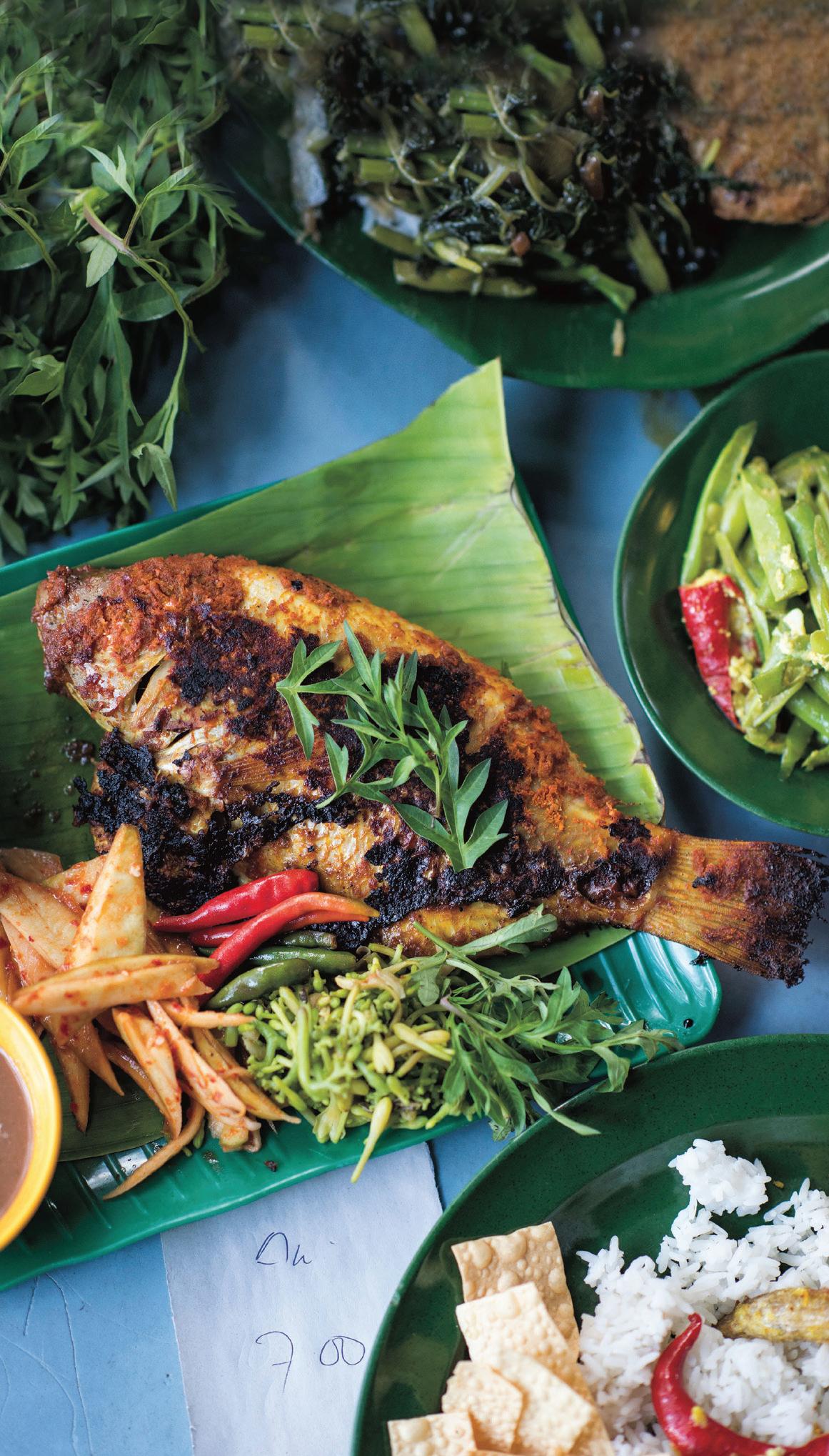 One of my favourite places to eat in Kuala Lumpur is at the huge hawkerstyle restaurant called Ikan Bakar Pak Lang, in Kampung Baru. It’s got to be among the busiest restaurants in the entire city, with constant queues that never seem to dwindle. In the middle of the open-air dining room is a huge spread of trays filled with food that you help yourself to, buffet-style. While there are around 50 different dishes, including varieties of curries, salads, grills and fried foods, the dish I always gravitate to is their ikan bakar, or grilled fish. This is no ordinary grilled fish, however; first it’s slathered in a thick paste fragrant with lemongrass, galangal, lime leaves, turmeric and chilli. Then it is wrapped in a banana leaf and cooked. As the fish grills, that fantastic paste fills the air with spicy fumes and the banana leaf scorches, giving off a lovely fragrance of its own and infusing the fish with wonderful flavours. In Malaysia they cook fish we might be unfamiliar with, but this dish translates perfectly to a backyard barbecue, using any white, firm-fleshed whole fish you prefer. They also use herbs that are only available in Asia, so I have suggested some more common herbs in this recipe.