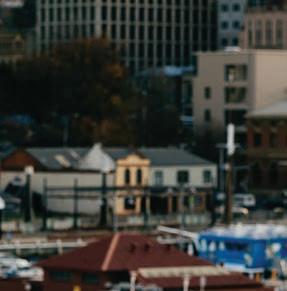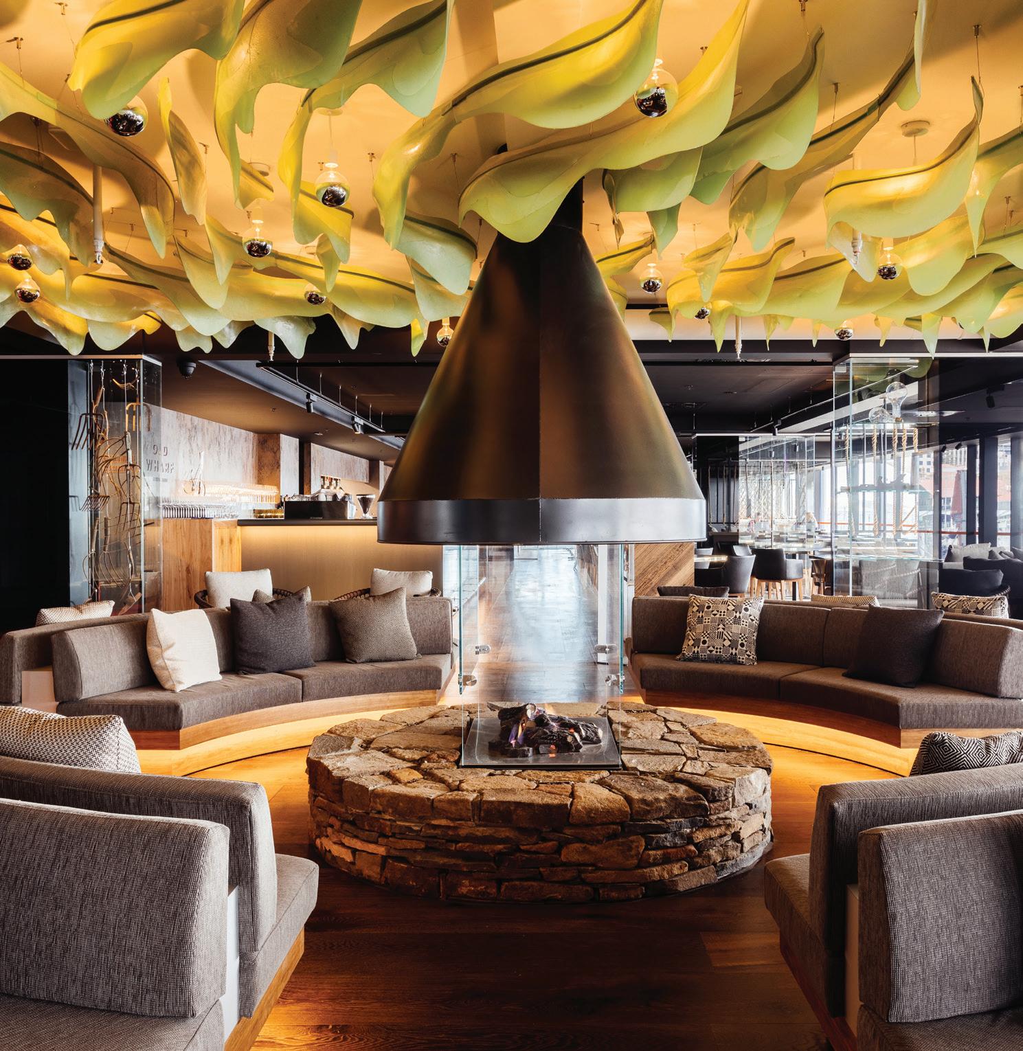 e downstairs lounge gives voice to the history of Tasmania's indigenous people. e circular stone fireplace, crafted by a local stonemason references oral storytelling, while cabinets display artefacts of the traditional Tasmanian Aboriginal toolkit. Laminated pages from e Mercury newspaper hang at the service area in the Story Bar, and the steel and recycled wharf timbers that have been used in the design of the Old Wharf Restaurant hark back to Tasmania’s various industrial histories.