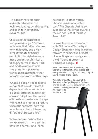 exception. In other words, Chassis is a domesticated tool.” The Chassis chair is so successful that it was awarded the red dot Best of the Best Award 2011. In town to promote the chair with Wilkhahn at Saturday in Design Singapore, Diez is looking forward to seeing the breadth of local Singapore design and the different approach to workplace design. View the Chassis chair installation by Stefan Diez for Wilkhahn at the red dot design museum: Friday 20 and Saturday 21 May between 11am – 6pm. Wilkhahn are a Major Sponsor of the Saturday in Design Singapore Opening and Closing Events, in conjunction with the red dot design museum. (65) 6221 1186 wilkhahn.com
