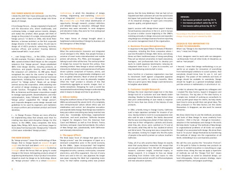 THE THREE WAVES OF DESIGN I divide the shift that I have witnessed over the fiftyyear period that I have practised design into three waves of change: • From Design Person … Design originated in handcraft and the decorative arts, where traditionally, and continuing today, a single person invents, designs, and makes the artefact. Most people still think of design as the product of a single, miraculously gifted “design person.” In Berlin in 1906, AEG hired Peter Behrens, a German architect, as the first corporate design director in the modern sense. His job was to design all of AEG’s products, advertising, factories, business offices, and workers’ housing. Behrens called himself AEG’s “court artist.” • ... over Design Policy … In the 1950s, inspired by the AEG example, Thomas J. Watson Jr., chairman of IBM, named architect Elliott Noyes as the computer industry’s first “design person”. Noyes established IBM’s total design identity, including products, architecture, and graphic identity, even assembling the company’s art collection. As IBM grew, Noyes recognised the need for the control of design to evolve from a single individual to internal functional departments. Initiating the transition from “design person” to “design policy”, Noyes set up design centres across the corporation, while retaining overall control of design strategy as a centralised corporate function. Throughout the 1960s, 70s and 80s, as American and European corporations sought to manage rapid growth, decentralisation, and internationalisation, many followed the model of IBM. “Design policy” supplanted the “design person”, and corporate designers wrote design manuals and guidelines to be used by engineers and marketers to ensure uniform and consistent product and brand identities. • … to Design Process: Policies are more effective for implementing ideas that already exist than for creating new ideas amid disruptive change. For this reason, in the 1980s, many companies, like Sony, Apple, Nike, Philips, NCR, Xerox, and Unisys, began to move away from bureaucratic “design policy” towards a third wave: embedded “design process.”