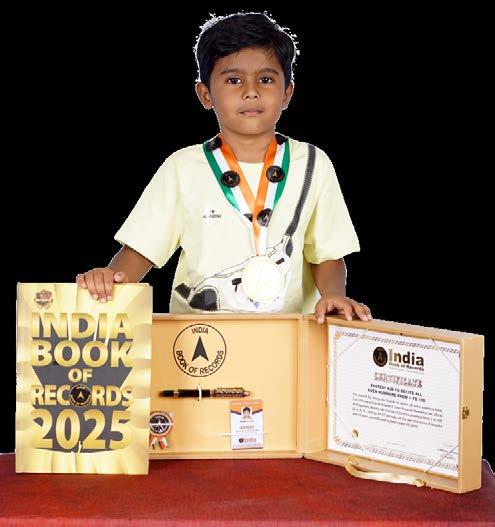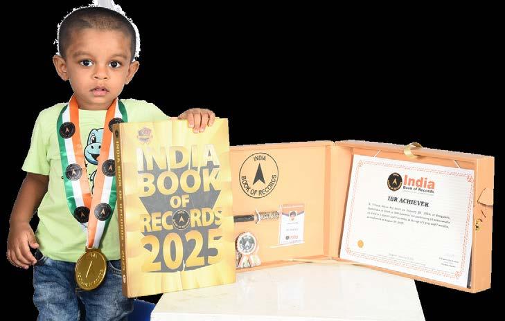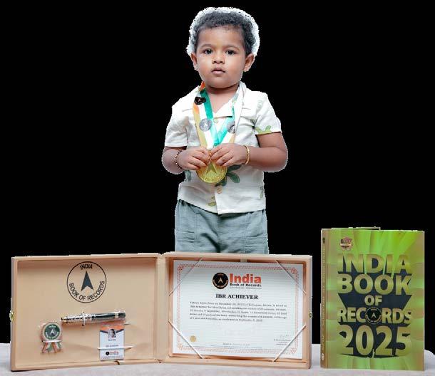 Reyansh Biswal (born on December 4, 2022) of Kendrapara, Odisha, is titled as ‘IBR achiever’ for identifying 21 parts of the body, 12 shapes, 34 animals, 9 birds, 10 flowers, 12 vehicles, 12 fruits, 14 vegetables, 10 colours, 12 sports and 9 musical instruments; reciting letters of the English alphabet with associated words, days of the week, months in a year and 10 English nursery rhymes; counting from 1 to 30, at the age of 2 years and 8 months, as confirmed on September 2, 2025.
