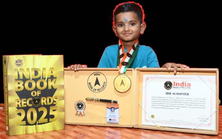 Dibyanshu Sekhar Sahoo (born on September 29, 2019) of Jagatsinghpur, Odisha, is titled as ‘IBR achiever’ for reciting the names of 5 oceans, 9 neighbouring countries of India, 7 mantras, 25 baby animals, 8 planets, 30 districts of Odisha, 28 Indian states with capitals, 100 English antonyms and 20 famous personalities; answering 60 G.K. questions, at the age of 5 years and 11 months, as confirmed on August 30, 2025.